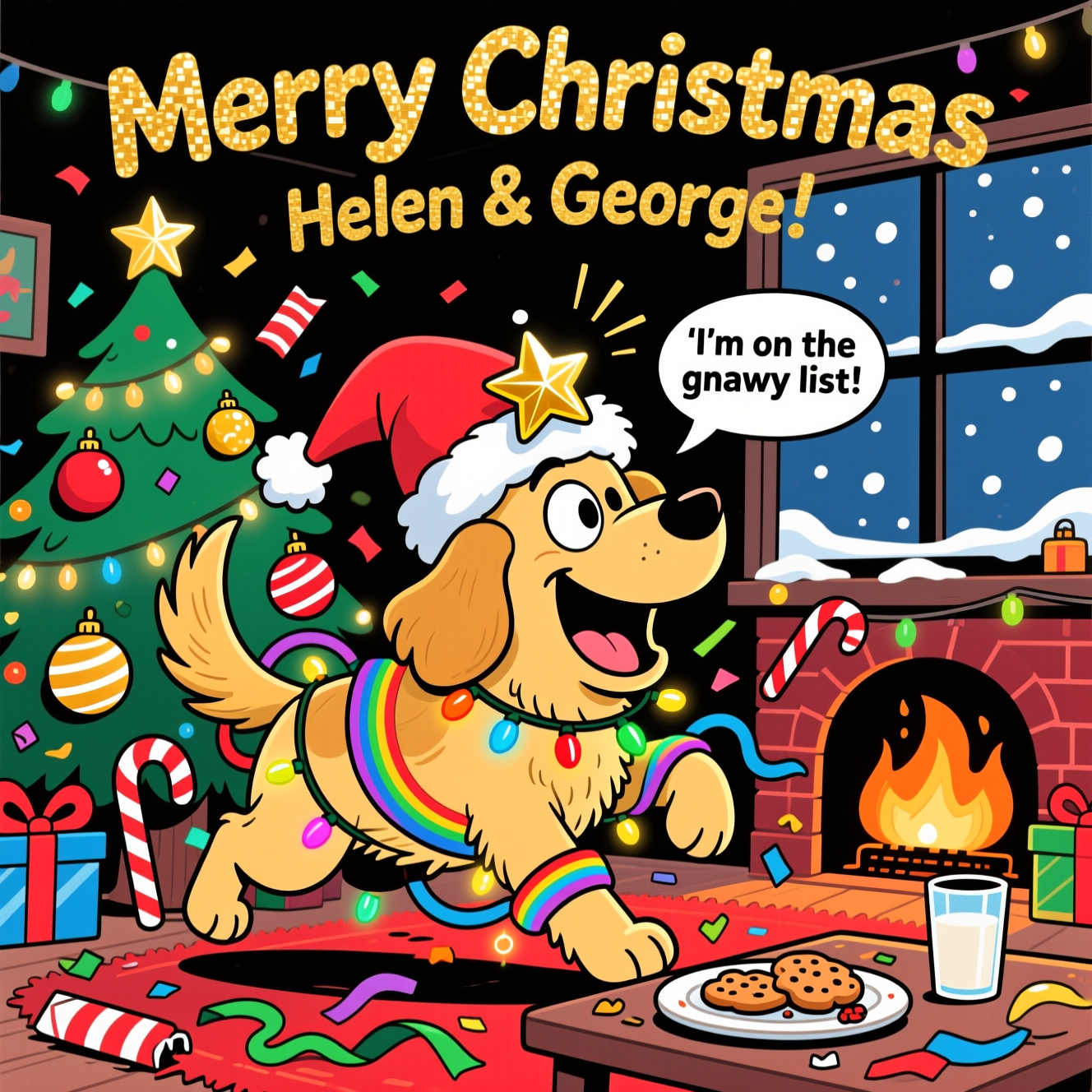 A funny, festive cartoon scene: In a cozy Christmas living room, a playful golden retriever named George bursts into the frame with exaggerated proportions and a huge goofy grin, tangled in glowing rainbow fairy lights and sparkly tinsel. His oversized, floppy Santa hat droops over one eye, and a shiny tree-top star is stuck to his nose. His giant wagging tail whips ornaments into the air, scattering gift wrap and ribbon like confetti. A plump Christmas tree stuffed with giant baubles and candy canes twinkles beside him; a plate of half-munched cookies and a tipping glass of milk add to the chaos. Snow drifts outside the window; a warm fire glows in the hearth. Thick black outlines, bright saturated reds/greens/golds/blues, bold shapes, and whimsical, energetic poses. Motion lines around the tail and lights, sparkles and soft glow throughout, clean vector-style finish, portrait, full-bleed.