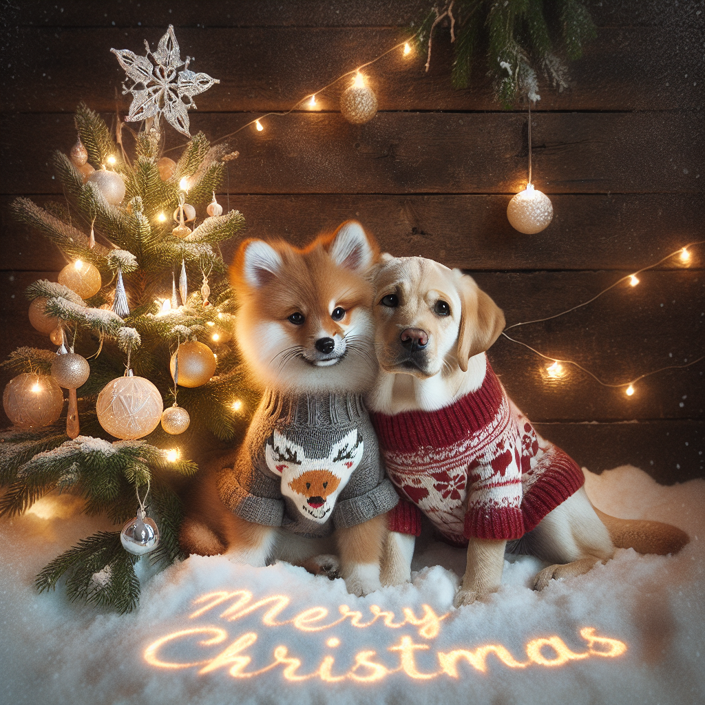 A snowy scene captures a fluffy 11kg fox-like small dog and a cheerful yellow Labrador in Christmas sweaters, cuddling by a festively decorated tree. The words 'Merry Christmas' are etched in the snow, illuminated by soft lights from the tree.