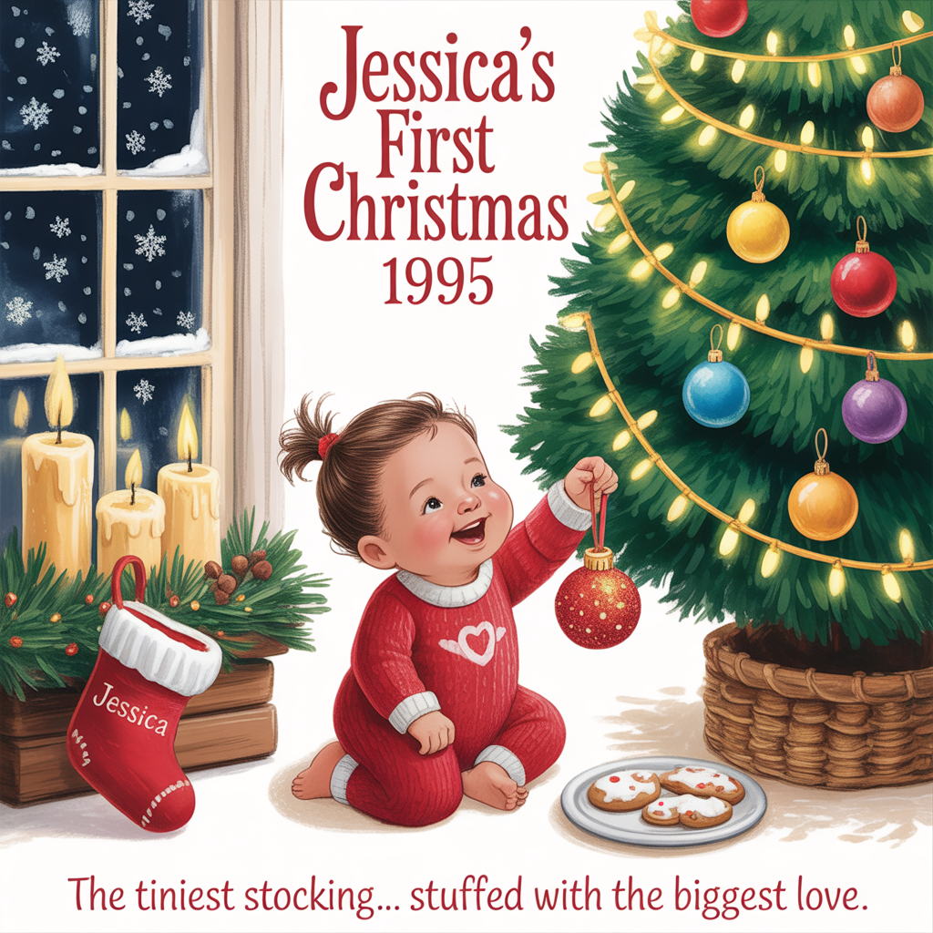 — In the center, illustrate a cozy, hand-drawn Christmas living room scene in warm, textured colors: a twinkling tree draped with colorful baubles and strands of tinsel, glowing fairy lights casting a soft golden hue, and under the tree, a plump baby in a red-and-white knit onesie (Jessica), giggling as she reaches for a glittery ornament. Beside her, a tiny stocking embroidered with “Jessica” hangs from the mantel, surrounded by chunky candles and evergreen garlands dusted with snow. Snowflakes drift softly outside the frosted window, and a plate of half-eaten cookies sits waiting for Santa. The whole scene should feel whimsical, heartwarming, and full of festive wonder.