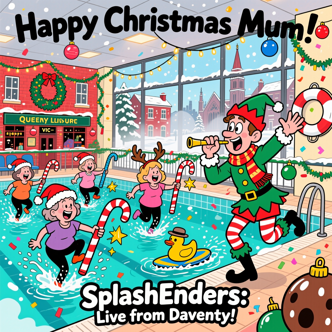 A playful, funny Christmas cartoon with thick black outlines, bright saturated colors, and exaggerated, whimsical poses. Inside a festively decorated indoor pool at Daventry Leisure Centre, a lively aqua aerobics class is splashing in sync: cheerful mums in Santa hats and reindeer antlers kick and groove with oversized candy-cane pool noodles, starburst water splashes sparkling around them. The energetic instructor on the poolside wears an elf outfit with a cheeky East End scarf, blowing a whistle and striking a big, theatrical pose. Tinsel, fairy lights, and giant baubles trim the railings; a Christmas-pudding lifebuoy hangs nearby; a rubber duck in a flat cap surfs a mini wave. Through steamy, frosted windows, hints of a snowy East End scene appear: red-brick terraces and a Queen Vic–style pub with a massive wreath; in the far distance, the snowy Daventry skyline with the Holy Cross Church spire. Warm glow, confetti-like snowflakes drifting indoors, big expressive faces, and dynamic, splashy motion for maximum comedy and charm.