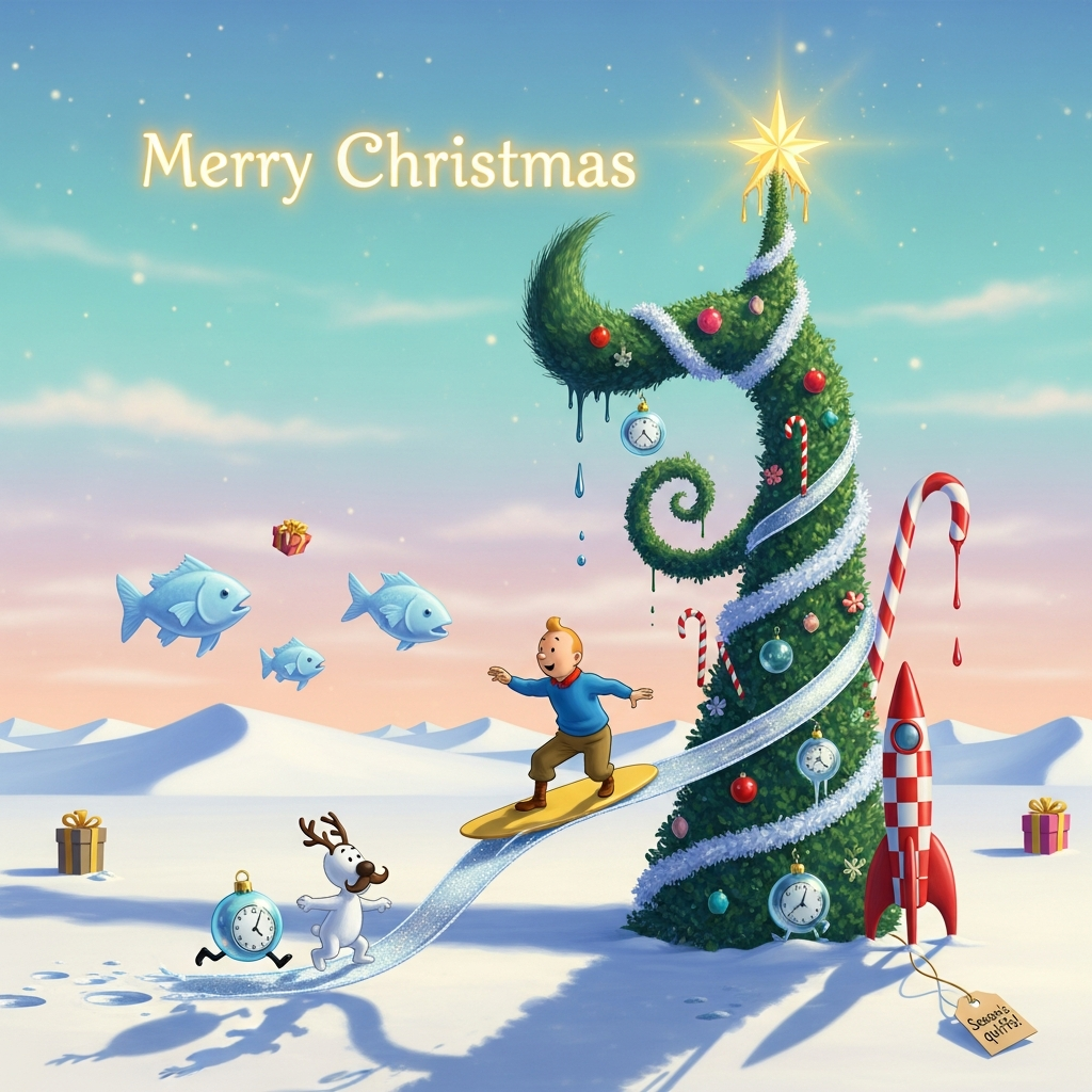 Dreamlike, Dali-inspired surrealism with ethereal lighting: In an endless snowy desert under a pastel mint–lilac sky, a towering Christmas tree curls into the shape of Tintin’s iconic quiff, its glass baubles slowly melting like soft clocks. Tintin, the quiff-haired young adventurer in a blue sweater and plus-fours, joyfully surfs down a curling ribbon of silver tinsel that behaves like a shimmering wave, while Snowy (wearing tiny reindeer antlers) chases a runaway bauble that has sprouted little legs and a mustache. The star atop the tree is a dripping compass rose casting warm golden halos; candy canes droop like liquid crimson icicles. A red-and-white checkered rocket leans by the trunk like a candy cane. Floating gift boxes morph into fluffy fish-shaped clouds; footprints bloom into miniature firs; elongated shadows stretch impossibly across powdered snow. Palette: frosty aquas, candy-cane reds, moonlit gold; sparkling highlights, soft haze, ultra-detailed painterly textures. Funny, whimsical, lighthearted mood; full-bleed composition with the quiff-tree centered and characters small but clear in the foreground.