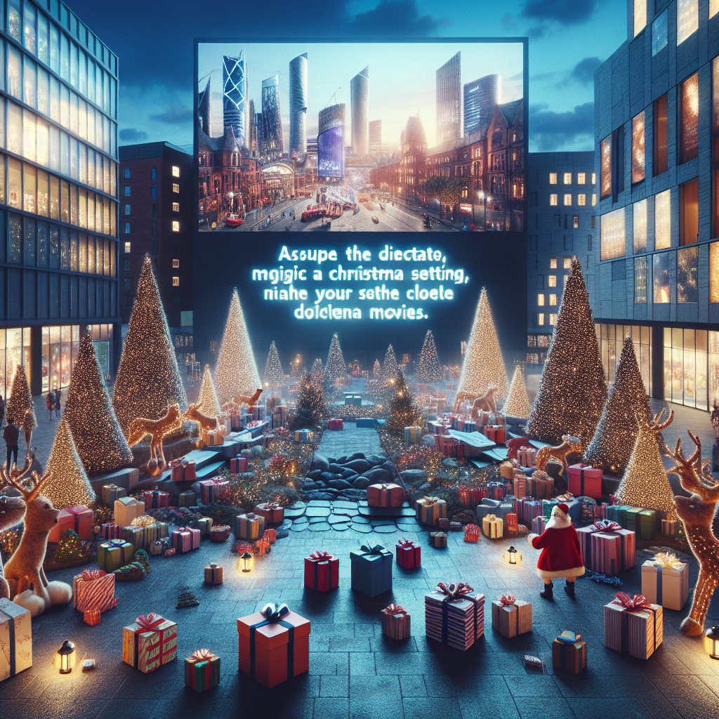 Imagine a quirky Christmas scene set against the urban backdrop of Manchester's Media City, where Christmas trees twinkle amidst the skyline. Gifts bear tags with witty Mancunian sayings as they sit piled beneath the trees. Santa is in the director's chair, orchestrating a fantastical live show with his reindeer crew, who sport miniature TV cameras. Nearby, larger-than-life screens stream classic Christmas films, while the aroma of seasonal delicacies fills the air, inviting everyone to savor the joyous atmosphere.