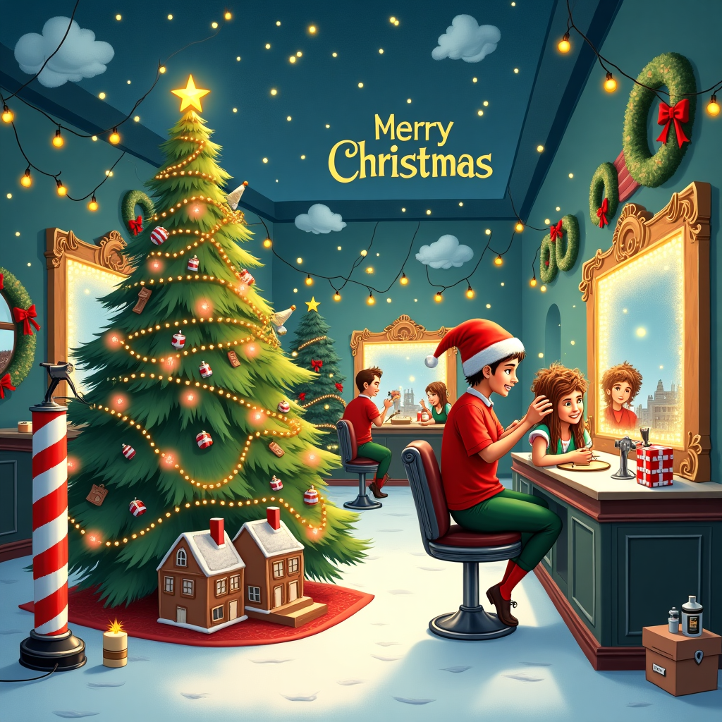 In a whimsical, bustling hair salon on a snowy Christmas Eve, a lively scene unfolds. The salon, adorned with twinkling fairy lights and wreaths of holly, is filled with the festive hustle and bustle of hairdressers busy at work. At the center, a flamboyant Christmas tree stands, uniquely decorated with tiny hairdressing tools – miniature scissors, combs, hairdryers, and colorful curlers replacing the traditional baubles. Underneath, a gingerbread village depicts a quaint town where each house is shaped like a different salon. Near the tree, a large mirror reflects the salon's warmth and the delighted expressions of customers being pampered. One hairdresser, a jovial elf with pointed ears and a cheeky grin, is skillfully crafting a customer's hair into a festive design resembling a reindeer, complete with small antlers and a red nose made of ribbon. In the corner, an old-fashioned phonograph softly plays classic Christmas tunes, its horn styled to look like a barbershop pole, swirling with red and white stripes. Above all, the ceiling is painted like a night sky, where fluffy clouds spell out "Merry Christmas Fr. Tschiedel" in sparkling stardust, ensuring the recipient's name twinkles brightly as the centerpiece of this joyous scene. The illustration captures the charm and cheer of a Christmas celebration tailored specifically for those who bring style and smiles through the art of hairdressing.