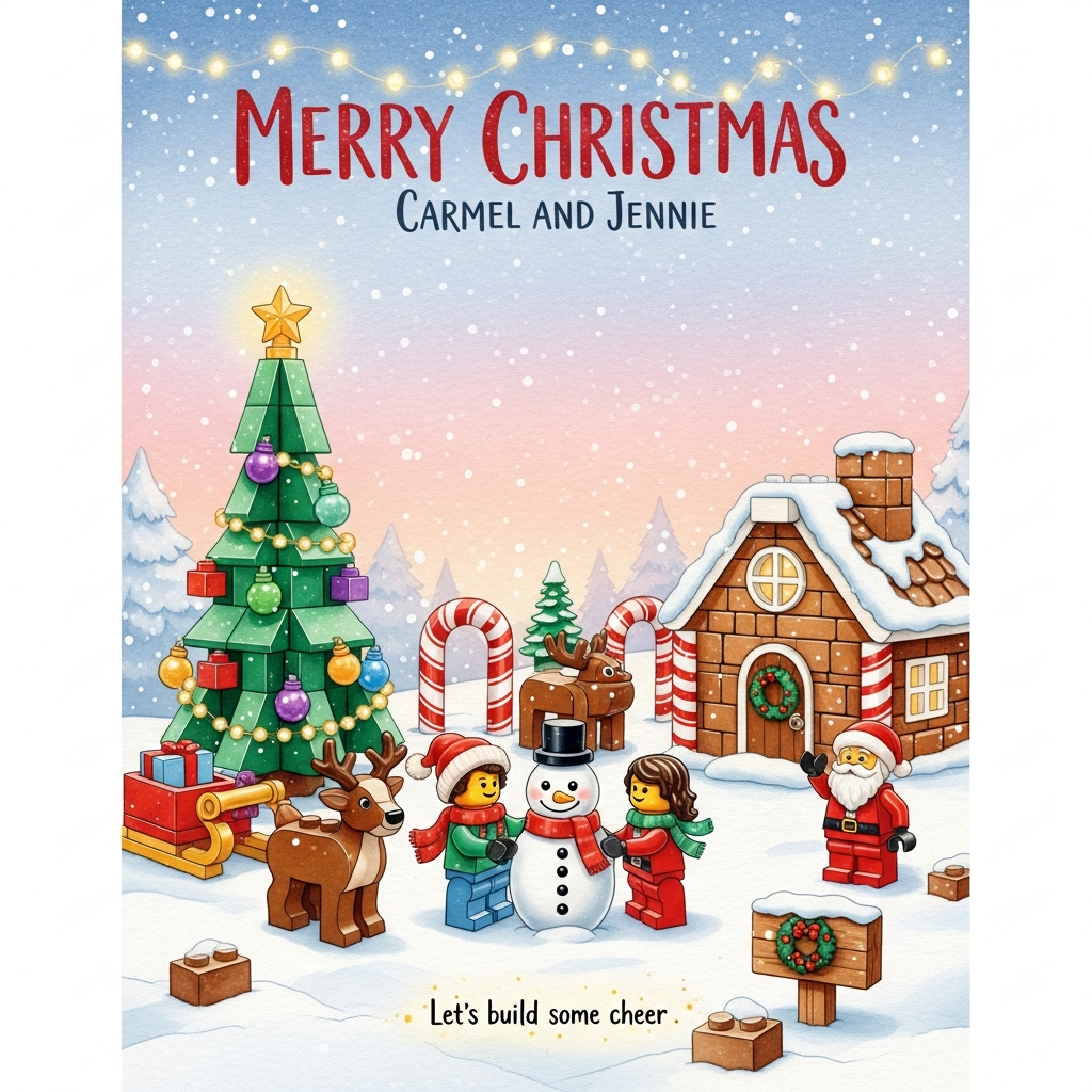 A cute, cozy watercolor winter wonderland built from LEGO-style toy bricks: a snowy village with a tall green brick Christmas tree sparkling with tiny block ornaments and a golden star, a brick-built reindeer and little sleigh, candy-cane arches, and a warm gingerbread-look house made of brown bricks dusted with icing-white snow. Two smiling minifig-style friends in colorful scarves build a white-brick snowman, while a jolly brick Santa waves nearby. Soft twilight sky fading from powder blue to rosy dusk, delicate pigment blooms, granulation, and visible cold-press paper texture; wet-on-wet washes, soft edges, gentle falling snow speckles, warm fairy-light halos for a dreamy glow. Hand-painted title lettering for the greeting at the top in rich cranberry watercolor with tiny gold flecks, playful and whimsical.