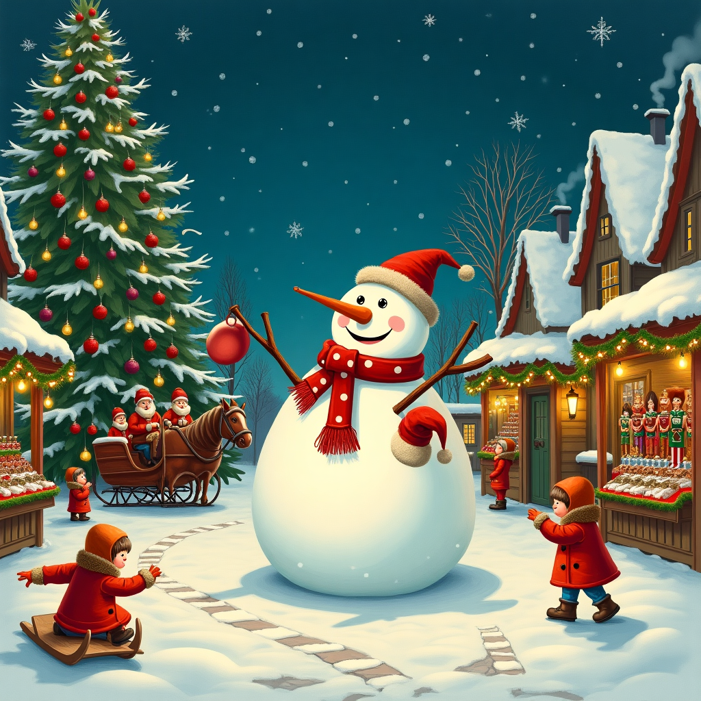 Around the snowman, children are gleefully playing, dressed in bright, vintage winter coats reminiscent of Norman Rockwell's festive illustrations. One child is perched on a wooden sled, while another is attempting to toss a red knitted hat onto the snowman's head. The cobblestone square is dotted with quaint market stalls, each draped with garlands of twinkling fairy lights, reminiscent of the intricate detail seen in Arthur Rackham's works. One stall is festively adorned with an array of colorful glass ornaments and hand-painted nutcrackers, while another is stacked with luscious gingerbread men with cheeky grins.