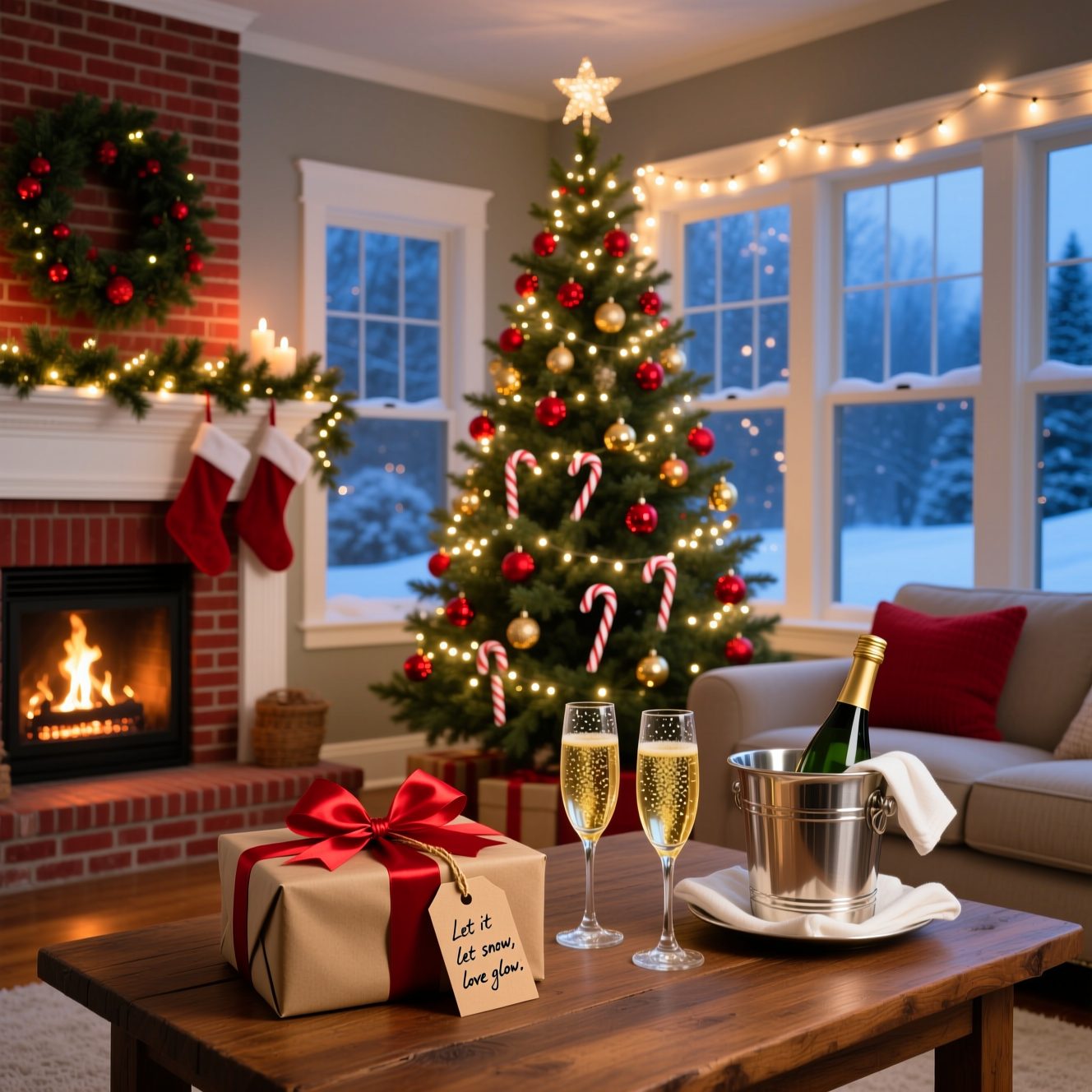 Foreground: a rustic wooden coffee table holding a single prominently wrapped present package in natural kraft paper with a lush red satin bow; a small kraft gift tag tied to the ribbon reads in neat handwritten script: “Let it snow, let love glow.” Next to it, two elegant crystal champagne flutes filled with golden bubbly (tiny rising bubbles visible), and a chilled bottle resting in a polished silver ice bucket with a folded white linen napkin.