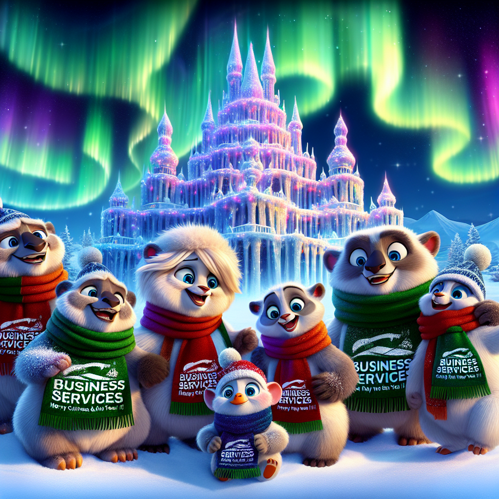 A group of playful cartoon animals wearing scarves with the 'KMS Business Services' logo, building a snow castle. Above them, the northern lights spell out 'Merry Christmas & Happy New Year !!!' in a dazzling display of colors.