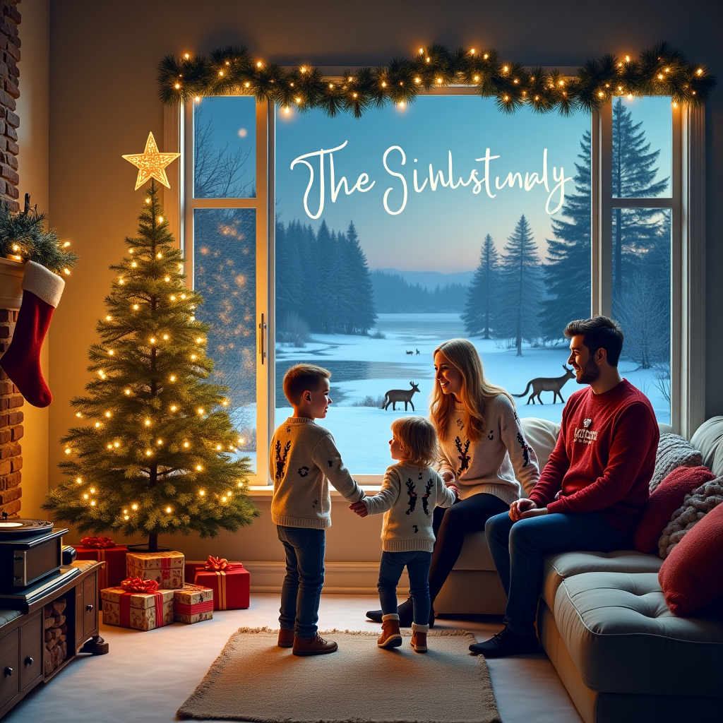 In the center of the room, a family of four—two parents and two children—gathers around a vintage-style record player, from which cheerful Christmas tunes emanate. The children, dressed in matching reindeer sweaters, are playfully dancing and giggling, while the parents, clad in cozy woolen jumpers, share a contented smile, holding hands and watching their kids with adoration. A garland of holly and ivy drapes over the mantle, while stockings hang, waiting to be filled.