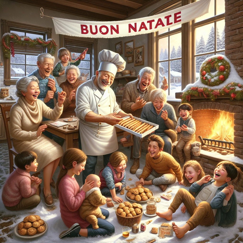 Outside, heavy snow blankets the ground, but inside, a spirited game of charades unfolds next to a crackling fireplace. A grandpa, donning a chef's hat, proudly presents his homemade cannoli, while the little ones decorate their aunt's hair with tinsel. A handcrafted sign reading 'Buon Natale' dangles above, adding to the merriment of this unconventional yet heartwarming holiday gathering.