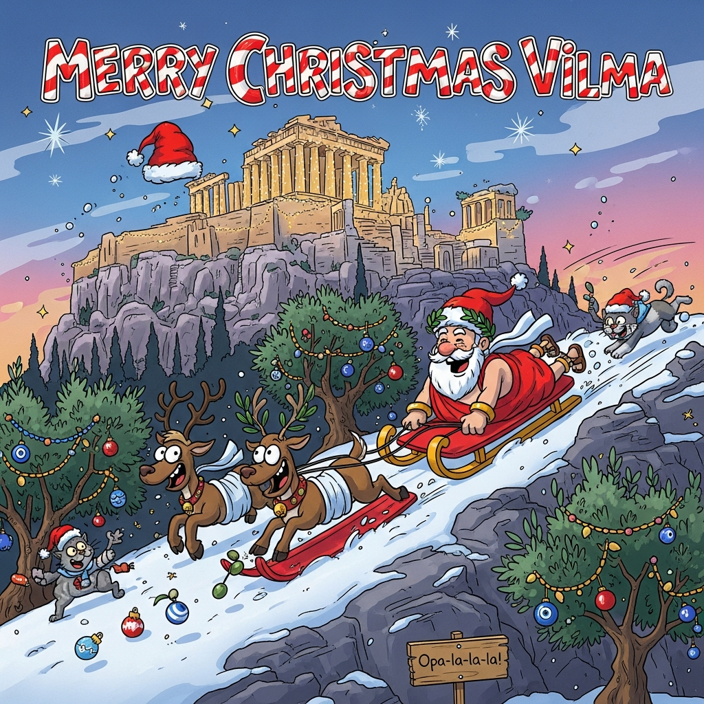 Funny, playful cartoon scene on Areopagus Hill in Athens at winter twilight. Thick black outlines, bright saturated colors, exaggerated proportions, and energetic, whimsical poses. Santa wears a red toga draped over his suit with a golden Greek-key trim and a laurel wreath, belly-forward and grinning as he surf-sleds his sleigh down the smooth rocky slope of the Areopagus. His reindeer, sporting laurel wreath antlers and huge eyes, clatter comically on the ancient stone—one slipping on a rogue olive, another striking a heroic pose in a blue-and-white scarf. A couple of cheeky Athens street cats in tiny Santa hats pounce on rolling baubles.