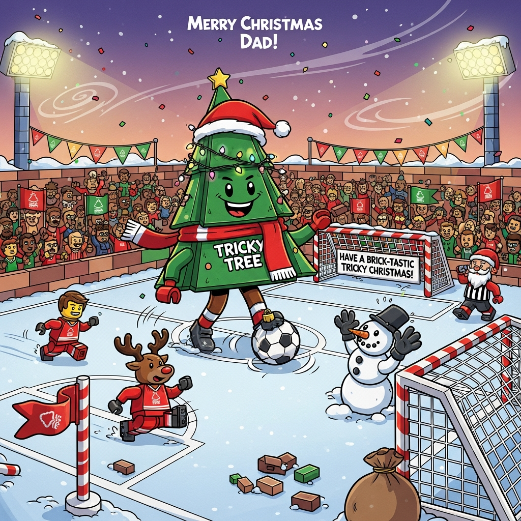 A bright, playful cartoon winter scene at a brick-built football pitch: a giant, cheeky “Tricky Tree” Christmas tree made from Lego-style bricks and fairy lights is the star striker, in a Forest-red scarf and Santa hat, doing keepy-uppies with a shiny bauble-football. Exaggerated, bouncy proportions, thick black outlines, and saturated colors (Forest reds, evergreen, snowy whites, gold). Lego-like minifig players in classic Nottingham Forest-inspired red kits with white trim slip and slide comically on the snowy pitch; one reindeer-striker skids past a snowman goalkeeper with carrot nose and glove saves. Candy-cane corner flags, blocky goalposts, and stands built from toy bricks packed with lively brick-fans waving little red-and-green pennants with stylized tree icons. Santa as the animated ref blowing a whistle shaped like a tiny brick; a bag of loose bricks has tumbled near the touchline. Twinkly floodlights, dusk sky, gentle swirling snow, and confetti add motion and festive sparkle. Clean, bold shading, expressive faces, and dynamic, energetic poses throughout.