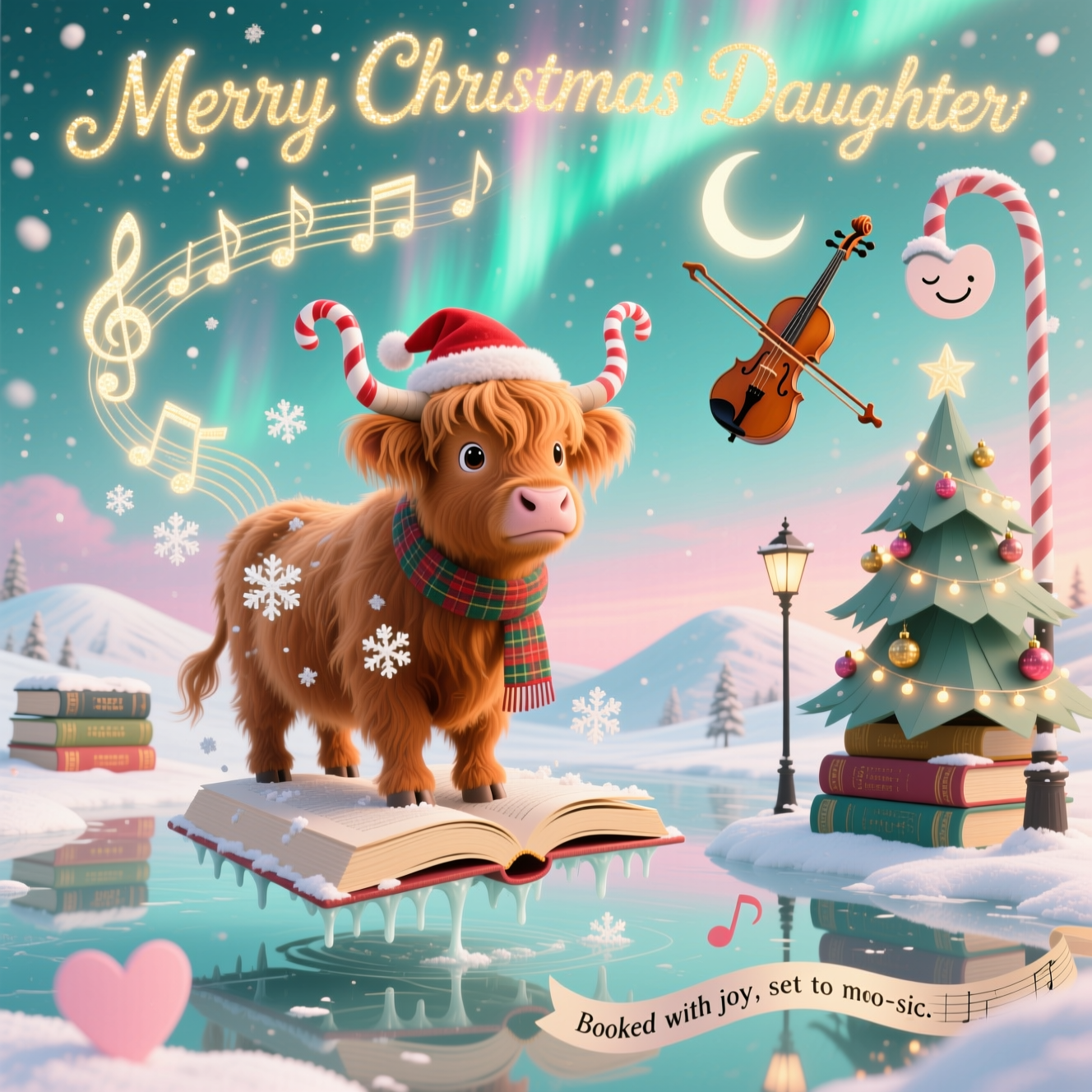 Dreamlike, Dali-inspired surreal winter wonderland with a cute mood: a fluffy ginger Highland cow at center, wearing a tiny tartan scarf and a dinky Santa hat, big kind eyes. Its curling horns morph into candy-cane treble clefs. The cow stands on a floating stack of open books whose melting pages cascade into delicate snowflakes and ribbon-like sheet music, drifting upward as glowing notes that twirl into an aurora across a teal-blush sky. A crescent moon shaped like a violin bow hangs low, while bendy candy-cane lampposts lean with a sleepy smile. To one side, a Christmas tree built from stacked books unfurls paper-branch fronds, decorated with tiny note-head baubles and warm fairy lights. In the distance, hill-shaped closed books rise from powdered-sugar snow, their embossed spines twinkling like constellations. Mirror-smooth ice reflects the scene; soft pastel bokeh blooms in heart and quaver shapes. Palette: frosty mint, blush pink, deep teal, warm gold; ethereal volumetric glow; gentle snowfall; soft painterly textures; whimsical scale shifts; full-bleed composition with the cow large and central, adorable and inviting.