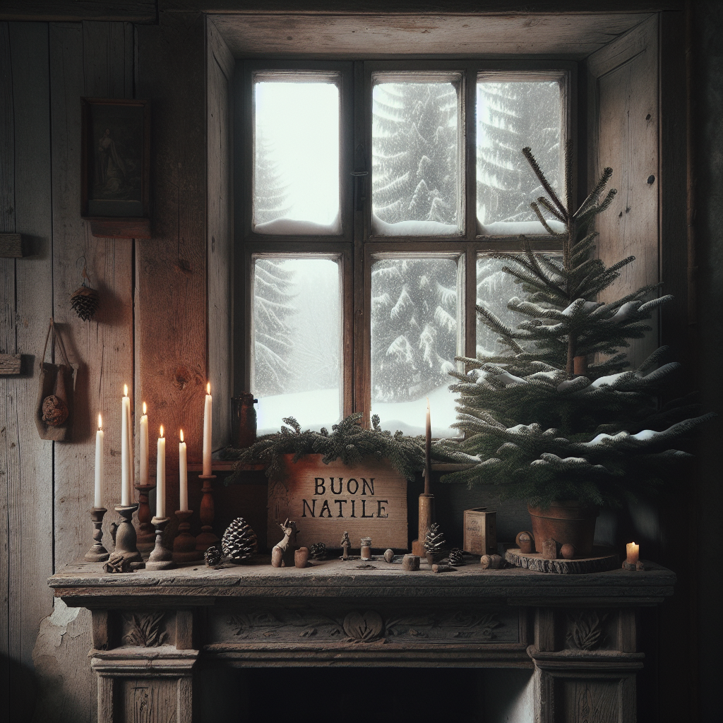 The scene unfolds inside an old-fashioned living room. A sparse evergreen tree stands in the corner, decorated with a few simple white candles and wooden ornaments. Snow gently falls outside the window, painting the world in a blanket of white. Centered on the mantelpiece is a hand-carved sign with 'Buon Natale' etched into the wood, underlined by a modest string of pinecones and holly.