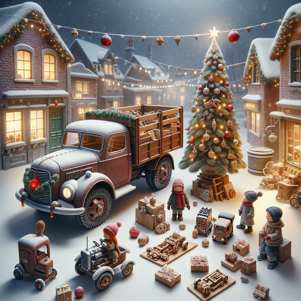 An endearing Christmas illustration depicts a cozy street corner under a gentle snowfall. A vintage European truck, decked out in garlands and a cheerful red nose, mimics a reindeer. In the truck's flatbed, a small, decorated tree stands surrounded by boxes and baubles shaped like European truck parts. Nearby, children in winter attire marvel at model trucks and engines crafted from gingerbread, adding a sweet note to the festive mechanical display.