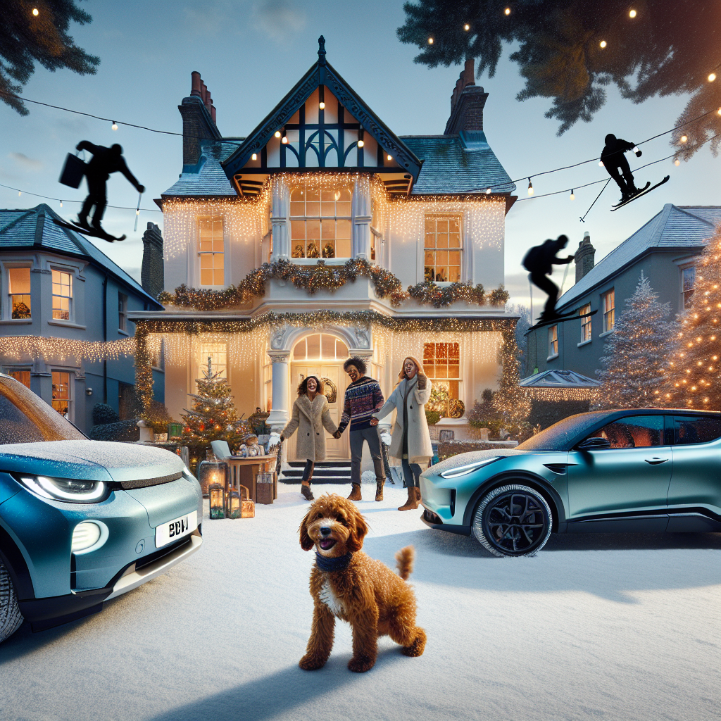 Under the soft glow of holiday lights, an Edwardian London house stands proudly, draped in festive decor. In the foreground, a family enjoys their Christmas outdoors, their small ginger cockapoo bouncing excitedly in the snow. Not far off, their blue Tesla Model Y and green Porsche Taycan glisten with frosty crystals. In the distance, silhouettes of skiers glide down wintery slopes, completing the picturesque Christmas scene.