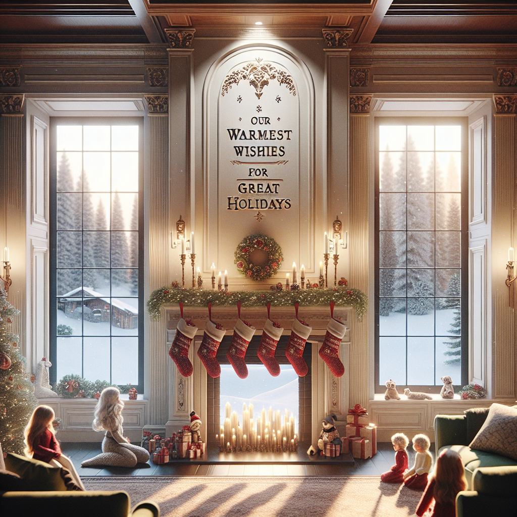 In the living room of a recently constructed house, the atmosphere is filled with the laughter of a happy family. The scene spotlights a picturesque fireplace where stockings are carefully hung, waiting to be filled. A delicately frosted window frames the space, revealing a serene winter scene outside. Embossed gracefully on the mantle is the greeting 'Our warmest wishes for great holidays,' infusing the room with the spirit of Christmas cheer.