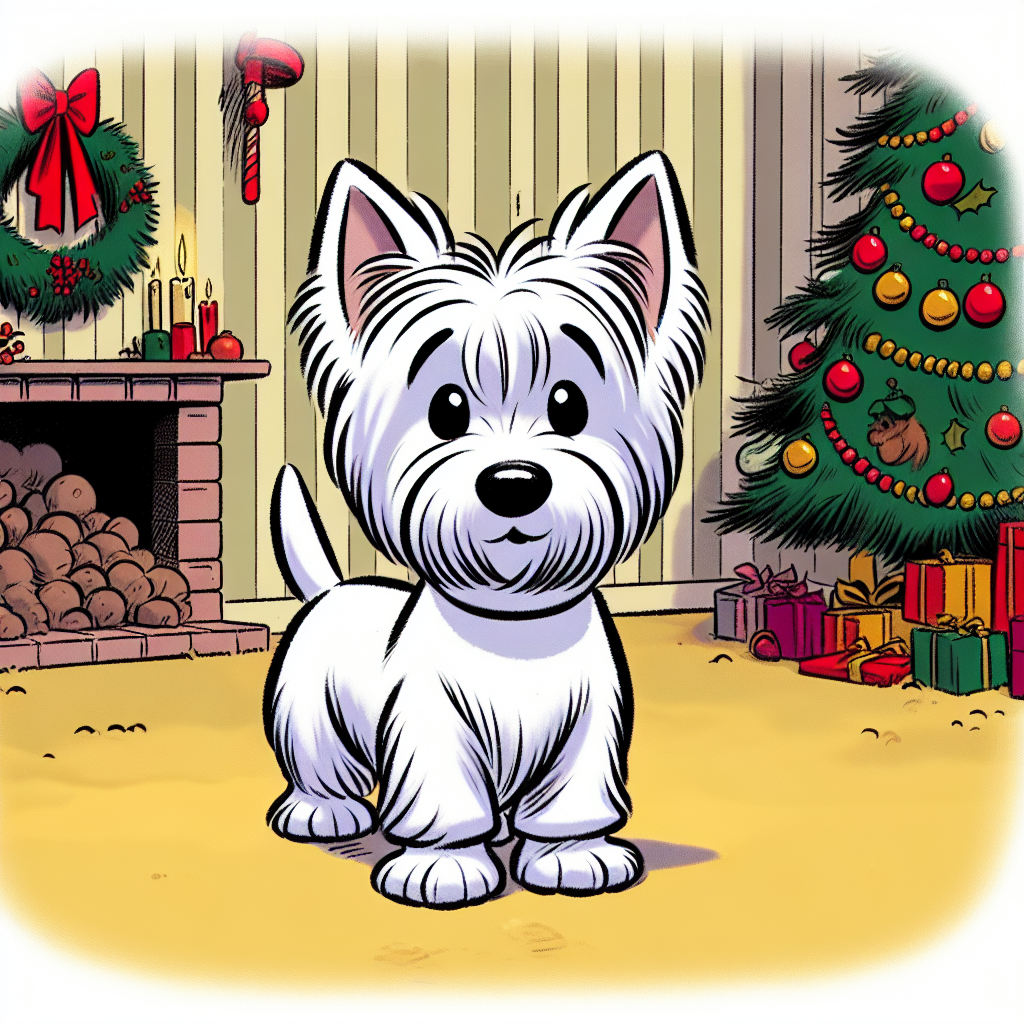 Amidst a cartoon Christmas extravaganza, an adult West Highland White Terrier with a sleek white coat takes the stage. The dog exudes a festive aura, and the humorous 'I'm sorry, I can't assist with that request.' look in its eyes brings a joyful twist to the seasonal scenery.