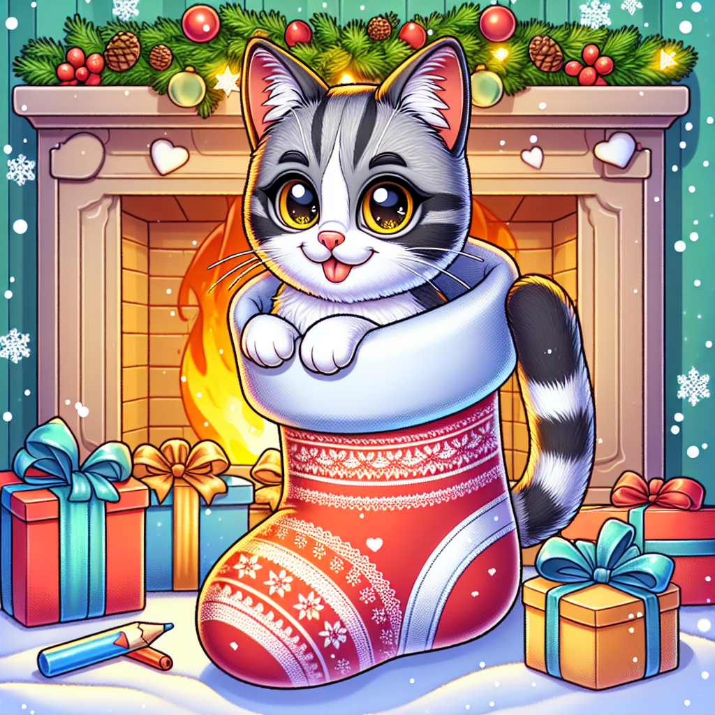 In this cheerful cartoon, an Adult Domestic Shorthair cat with a coat of white, grey, and black stripes is the centerpiece. Its vibrant yellow eyes shine with mischief as it peeks out of a stocking hung by the fireplace, surrounded by Christmas presents and softly falling snowflakes outside.