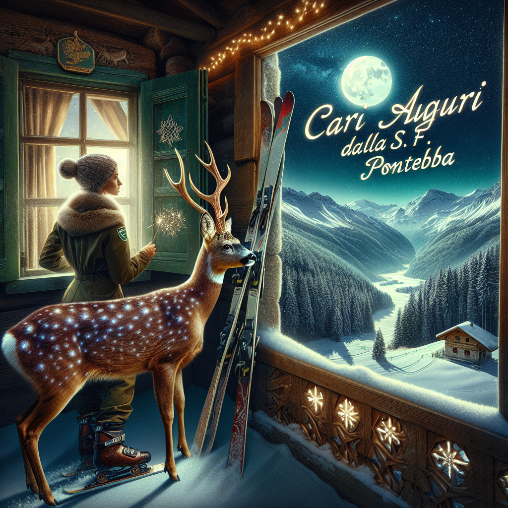 In the second variation, the scene takes on a night setting, where a forest ranger in a cozy cabin looks out the window at a magical, moonlit winter landscape. Skis are propped up against the cabin's outer wall. A roe deer with an unusually vibrant coat that glistens under the moonlight acts as the guardian's companion. Together, they seem to be awaiting something extraordinary. Above this tranquil tableau, the starlit sky doubles as a canvas for the heartfelt 'Cari Auguri dalla S.F. Pontebba,' written in elegant, shimmering script that mirrors the stars.