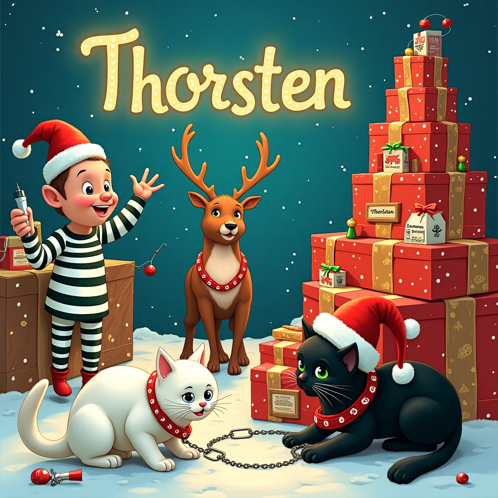 In the background, a reindeer wearing a BDSM-inspired harness made of soft, red velvet with gold bells is helping load the sleigh. Above it all, the name “Thorsten” is cleverly formed by string lights, blinking joyfully in the shape of clouds suspended in the azure sky, surrounded by twinkling stars. The entire setting is a flurry of playful chaos, but undeniably charming and filled with Christmas cheer, each element masterfully woven to reflect the requested themes.