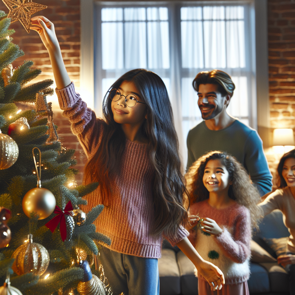 In the animated scene, the spirit of Christmas envelops a cozy cartoon room, where a luscious evergreen tree adorned with twinkling lights and festive trinkets serves as a jovial focal point. Nestled under its boughs, a little girl aged 10, her long blonde hair cascading past her glasses, carefully places the star atop the tree, concentration etched on her youthful face. Her older sister, 13, with long, curly blonde locks bouncing as she circles the tree, adds the finishing touches to the pine's arrangement, her joyful giggles blending with the soft carols in the background. Their mother, sporting an unconventional asymmetrical haircut that fades from brown to blond in the front, oversees the scene with a genial chuckle, the warmth of the holiday reflected in her demeanor. Observing the lively decorating activity, the father, with concise brown hair and a tidy beard framing his bespectacled face, holds up his phone to capture the precious family tableau, securing the memory of a Christmas filled with love and togetherness.