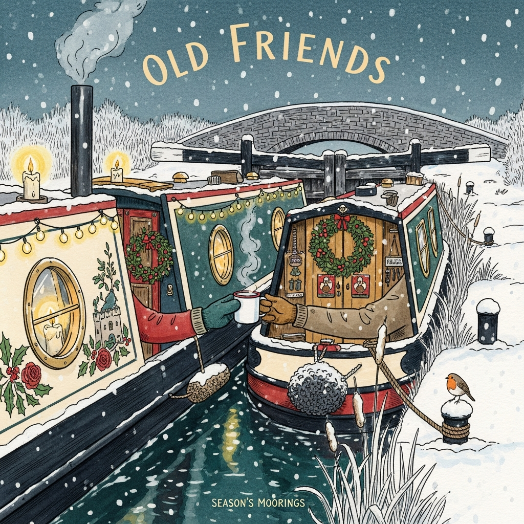 Two friends share a quiet moment: gloved hands pass a steaming enamel mug across the narrow gap between boats—faces only hinted with soft, minimal lines for a universal, sincere feel. A robin perches on a snow-dusted mooring rope; frosted reeds and bollards edge the towpath. The scene feels still and heartfelt, emphasizing companionship and the hush of winter.