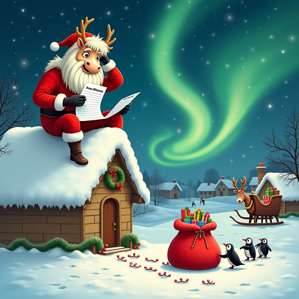 In a whimsical snowy wonderland, picture a scene bustling with holiday mischief. Father Christmas, with his iconic red suit and bushy white beard, is in quite a peculiar predicament. He's sitting on the roof of a charming little cottage, its snow-dusted thatched roof just beneath him, while holding a long list of names in one hand and scratching his head with the other, clearly perplexed. Beside him is an unexpected assistant – a Shetland pony, short and stout with a thick, fluffy mane adorned with a jingle bell wreath. The pony is wearing oversized, comical reindeer antlers that are slightly askew, suggesting it might not be entirely thrilled with the costume. Its expression is one of playful indignation, eyes wide, adding a dash of humor to the scene.