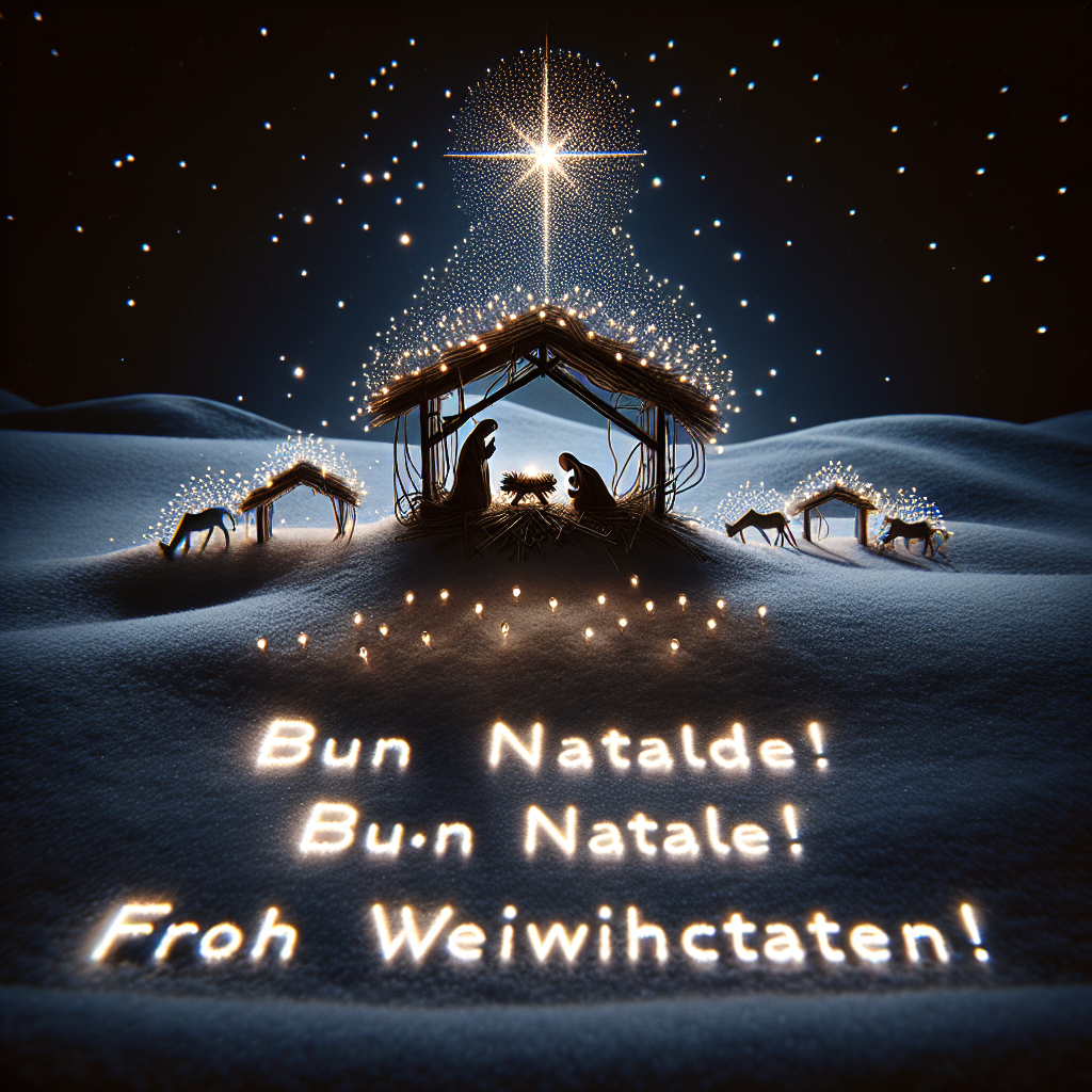 A solemn Christmas illustration depicts a serene night sky filled with gently twinkling stars. In the center, a stable warmly lit from within showcases a nativity scene. An array of intricate electrodes and wires form a delicate circuitry-patterned halo above the manger. Subtly blending into the snowy landscape beneath, the multilingual holiday greetings 'Bun Nadé! - Buon Natale! - Frohe Weihnachten!' are etched into the snow in a whimsical, glowing font, powered by tiny embedded LEDs.