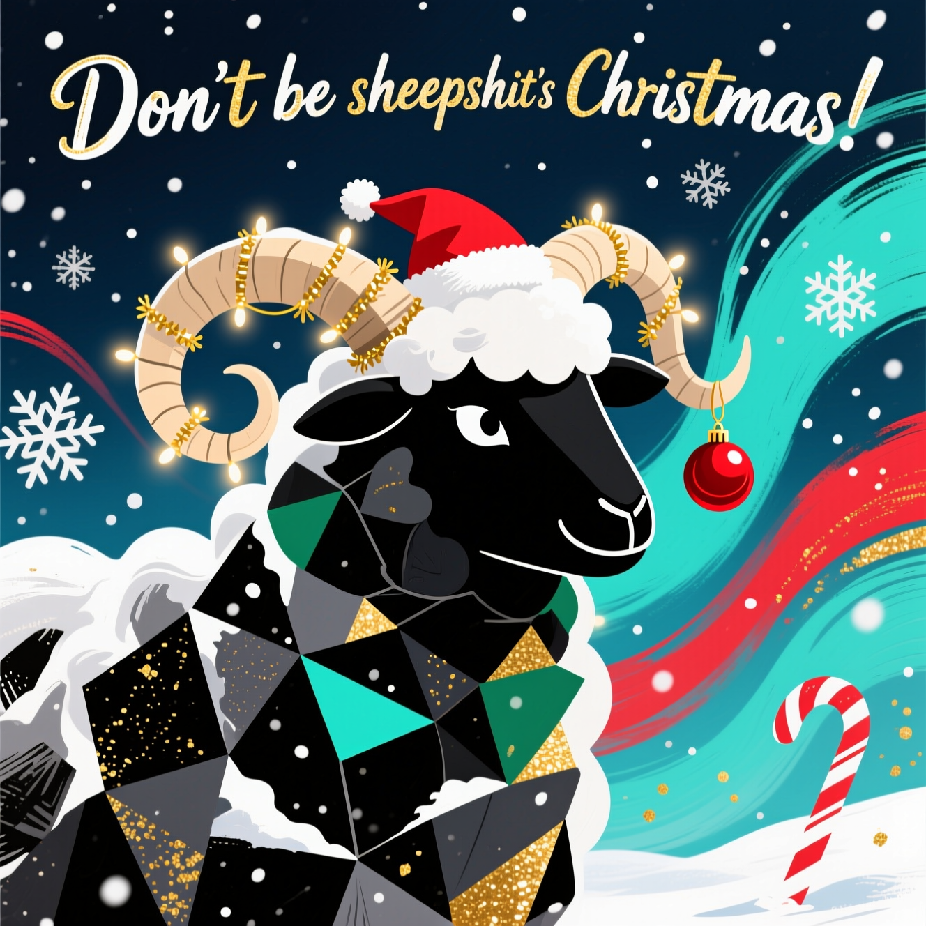 Vertical, image-first abstract scene: a mischievous black sheep with large curled horns dominates the center, built from bold geometric shapes and sweeping fluid curves with dynamic brush-stroke textures. The horns arc upward toward the caption, wrapped in twinkling fairy lights and tinsel; a tiny Santa hat perches askew; a red bauble dangles from one horn. The fleece is a collage of obsidian and charcoal shards with flashes of snowy white; the sheep gives a cheeky side-eye and sly crescent grin for a funny vibe. Background: high-contrast winter night in a deep midnight-blue-to-icy-teal gradient, energetic painterly swirls, geometric snowflakes, candy-cane red stripes, mint arcs, and specks of gold sparkle. Palette: inky black, snow white, candy red, holly green, aqua/teal, metallic gold; saturated and punchy. Lighting: soft rim glow around the sheep; warm glints from the fairy lights; delicate snowfall fleck. Render the caption in hand-painted brush lettering, creamy white with a thin gold-sparkle outline and subtle drop shadow for legibility, slightly arced across the top; keep the text small and the art big. Modern, expressive, humorous; no extra text, no watermark, no border.
