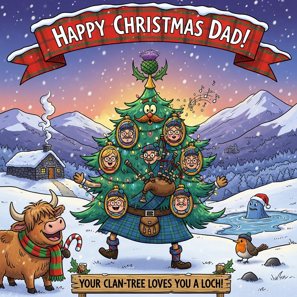 A bright, funny cartoon scene in the snowy Scottish Highlands at dusk: a gigantic, anthropomorphic Christmas “family tree” stands proudly center stage, wearing a blue-green tartan kilt and tiny sporran, with googly eyes, a friendly ginger moustache, and pinecone knees. The tree strikes an energetic, open-branch pose as if introducing the clan. From its branches dangle framed, cartoon family-portrait baubles—cheery faces with rosy cheeks, tartan tam o’ shanter hats, glasses, and daft expressions—arranged like a branching family tree. Twinkly fairy lights loop through the branches like bagpipes, and the tree “plays” them with puffed cheeks and musical-note snowflakes drifting out. The star topper is a golden thistle.