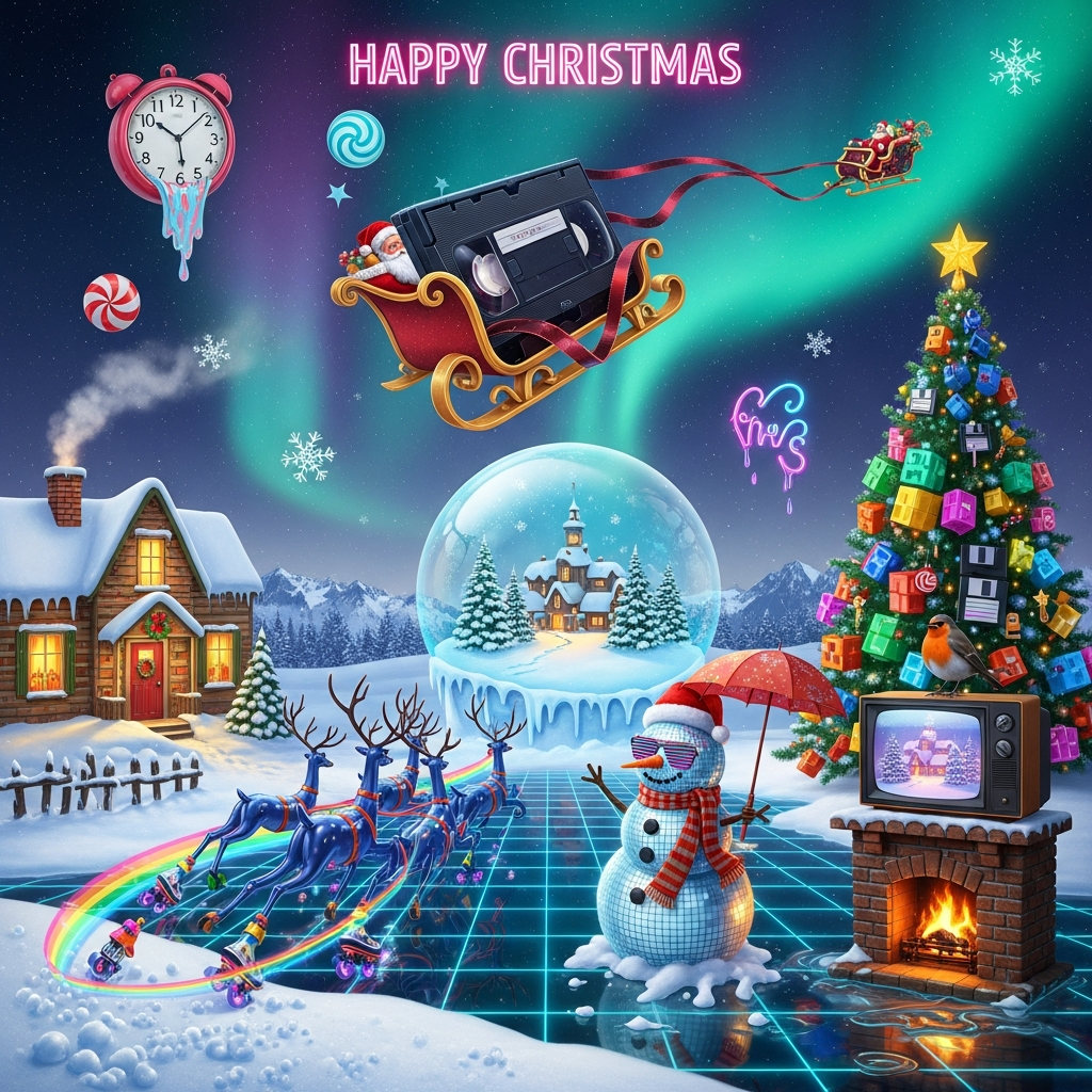 Portrait, full-bleed, funny dreamlike surreal winter scene blending 80s/90s retro with traditional Christmas postcard charm. Center stage: a giant VHS cassette morphed into Santa’s sleigh, its unraveled tape flowing like a silky beard in impossible spirals. It’s being “pulled” by chrome reindeer on rainbow rollerblades, leaving neon trails across a melting snowfield that warps into an 80s laser grid. A disco-ball snowman with shutter shades and a joystick carrot nose waves a candy-cane umbrella that melts like wax. To the left, a warm-glowing Victorian cottage (holly wreath on the door, candlelit windows) floats atop a drift of powdered-sugar snow, its chimney smoke curling into 90s Memphis squiggles. To the right, a Christmas tree built from glossy 3x3 color puzzle-cubes slowly droops and drips; ornaments are floppy disks and cassettes; the topper is a pixelated 8-bit star. A robin perches on a vintage CRT television displaying a crackling fireplace that acts as a portal, casting golden light onto the icy ground.
