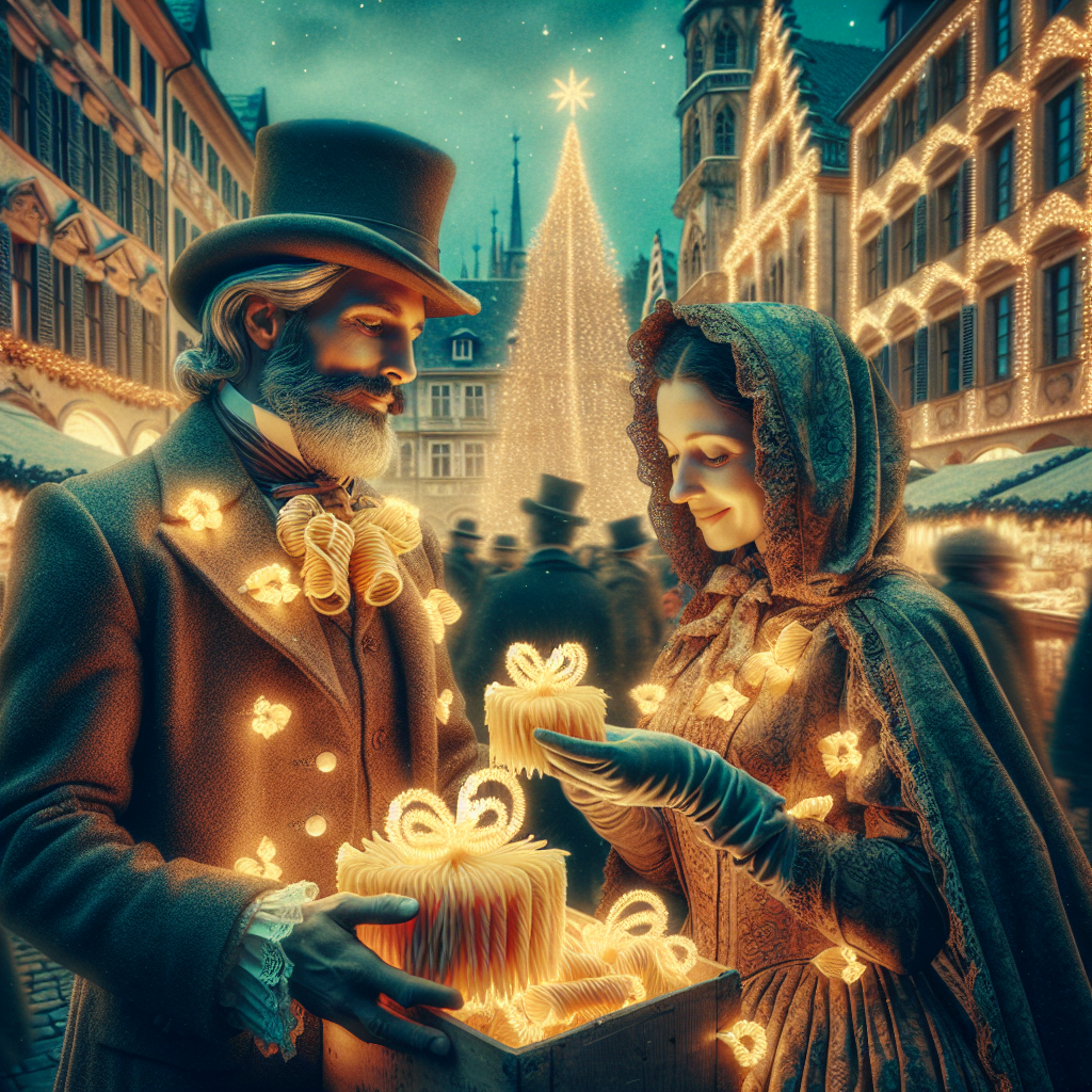 Set in Giesing, a surreal Christmas market bustles, where a couple in 1860 period costume exchanges gifts of delicate pasta shaped like iconic Christmas symbols. Realistic festive lights reflect off their vintage clothing, casting an otherworldly glow, while historic architecture stands festively adorned, blurring lines between past and present.