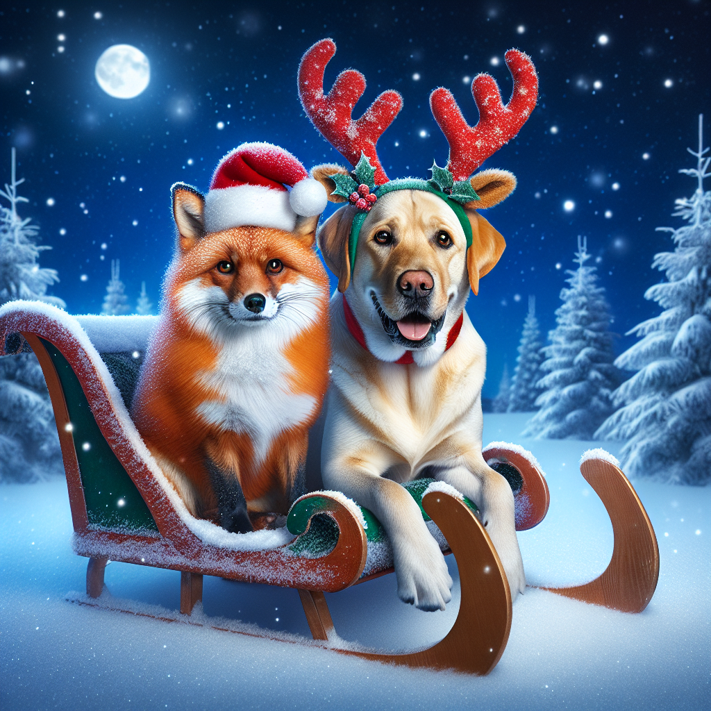 Under a clear winter sky, a spirited 11kg fox-like small dog in a Santa hat and a yellow Labrador with reindeer antlers sit side by side in a sleigh. The glistening snow beneath them forms the phrase 'Merry Christmas', with snowflakes gently falling around.