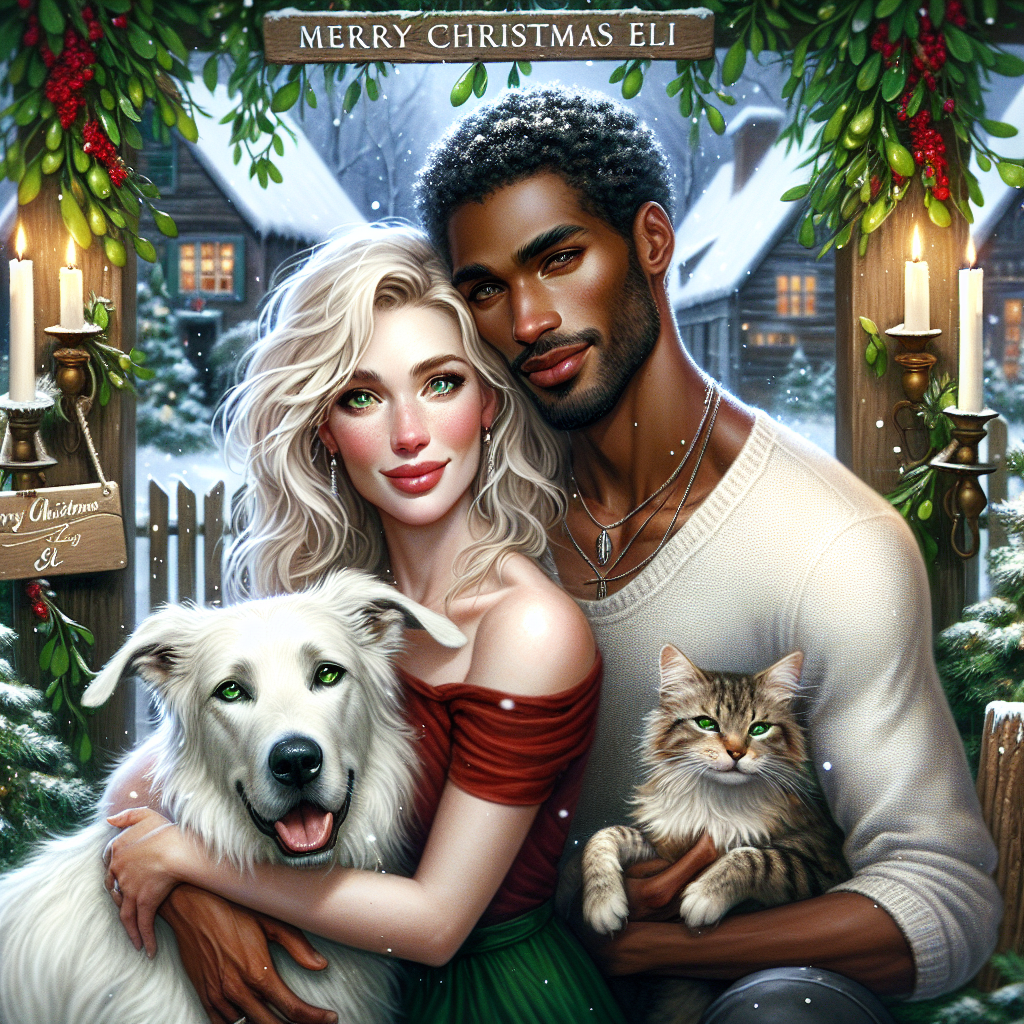 The scene unfolds on a serene Christmas Eve, where a white blonde woman with sparkling green eyes and a tall brown man with soulful brown eyes share a warm embrace under a canopy of mistletoe. Their devoted white wolfhound dog sits by their side, eyeing the camera, and the small pretty tabby cat weaves between their legs, purring contently. Softly falling snowflakes add a magical touch, while 'Merry Christmas Eli' is etched into a wooden sign, which hangs on the nearby fence, completing the picturesque holiday moment.