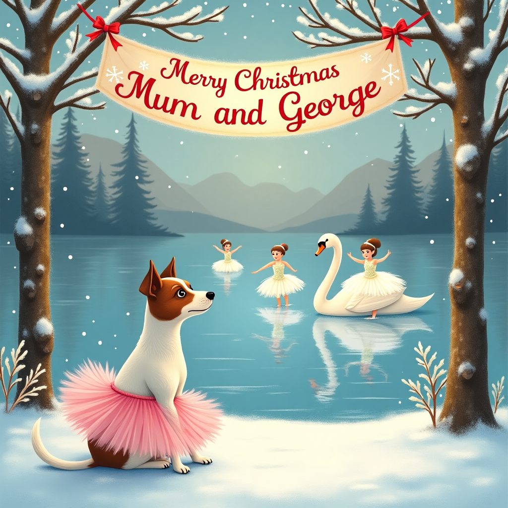 Generated with these themes: Jack Russel dog wearing tutu sat watching, Ballet dancers, Banner with Merry Christmas Mum and George, Swans, and Wintry frozen lake.