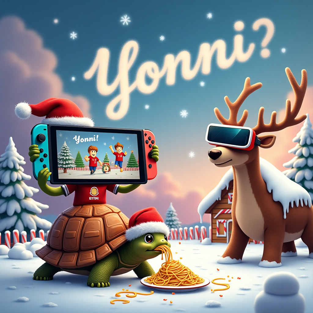 Behind them, a sky streaked with a soft gradient of twilight purples and blues features fluffy clouds spelling out "Yonni" in looping, cheerful script, as if written by a magical North Pole breeze. Nearby, a comically oversized, animated reindeer wearing VR goggles is immersed in its own Nintendo Switch adventure, utterly oblivious to the antics around it. Nestled in the snow at the reindeer's hooves, a quaint gingerbread house, with icing icicles and peppermint stick columns, adds a cozy touch. The landscape is dotted with marshmallow snowmen and candy cane fences, setting the stage for a truly enchanting and humorous holiday tableau.