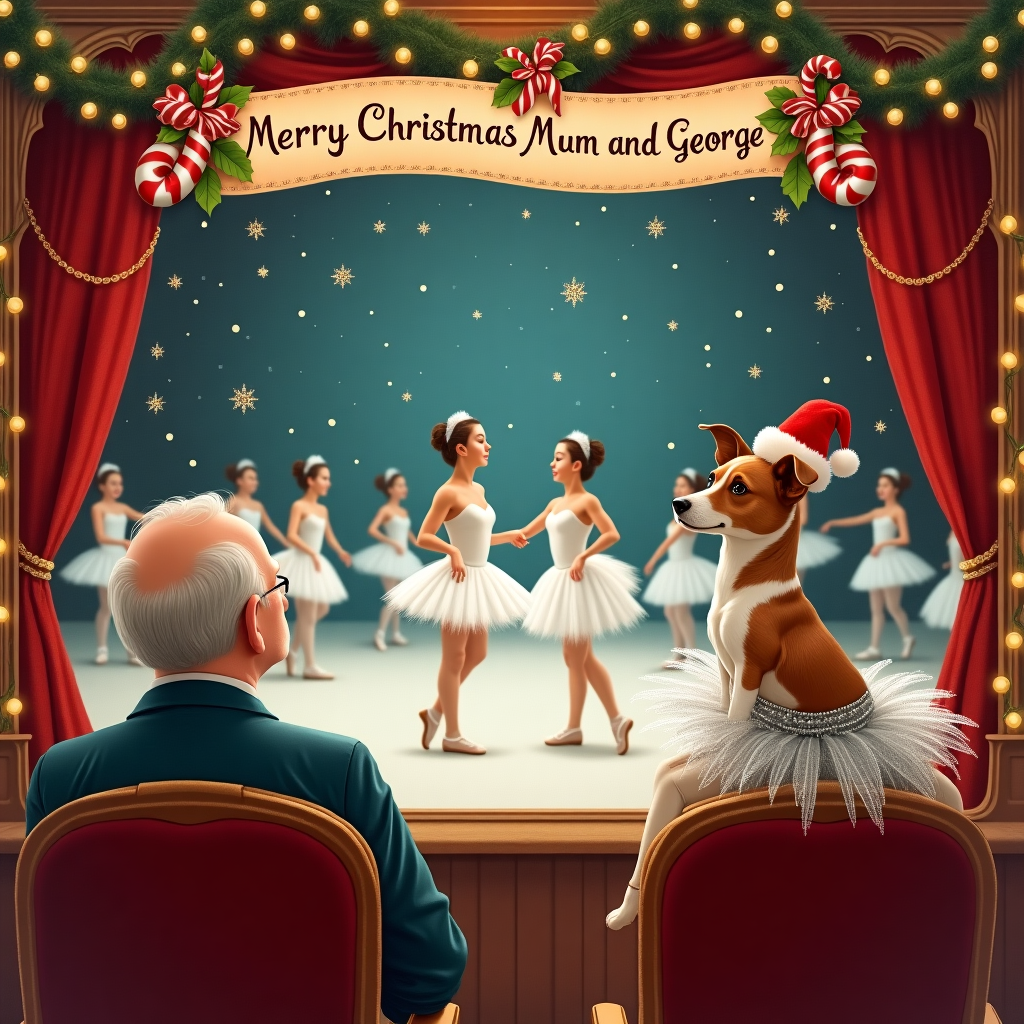 In this enchanting Christmas card scene, set within a cozy, softly-lit theater, a delightful Jack Russell Terrier wearing a sparkling silver tutu is perched in the plush velvet seat next to an elderly gentleman, presumably George, and a kindly-looking woman, presumably Mum. The theater's opulent interior is filled with festive garlands and twinkling fairy lights draped around the ornate architecture. Center stage, amidst a flurry of delicate snowflakes descending from above, ballet dancers clad in pristine white tutus and elegant feathers gracefully perform Swan Lake, their movements as gentle as the fluttering of angel wings. Above the stage, a whimsical banner adorned with holly and candy canes, reads "Merry Christmas Mum and George" in elegant cursive script, with each letter intricately painted in shades of red and green. The audience is captivated, but the Jack Russell is particularly attentive, sitting upright with its ears perked, eyes wide in admiration of the dance. The charming dog has a miniature Santa hat resting slightly askew on its head, adding to the festive allure of the scene. Above, the velvet stage curtain is embroidered with subtle golden snowflakes, enhancing the magical ambiance of this Christmas ballet.