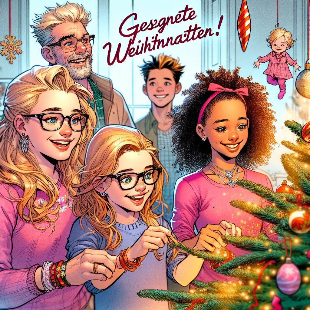 In this version, a picturesque cartoon depiction of Christmas is brought to life. The scene centers around a cozy family gathering. Two girls, one 10 with long, blond hair behind glasses and the other 13 with her dark-blond, curly tresses, are playfully arranging the last ornaments on the Christmas tree. Their mother, slightly overweigh with an asymmetrical haircut and tasteful blond highlights, is laughing beside them, while the father, with short tidy hair, glasses, and a short beard, watches over the family with a content smile. Settling perfectly into the festive backdrop, 'Gesegnete Weihnachten!' is carefully scripted at the top, ensuring no detail is overlooked.