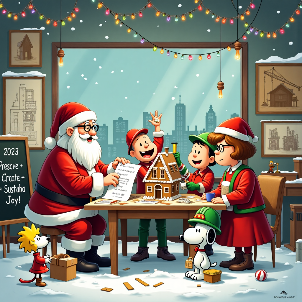 In the background, a group of elves, equipped with tiny hard hats and tool belts, are busy constructing a model of a gingerbread house, complete with gumdrop windows and licorice beams. This model sits on a snow-dusted drafting table, surrounded by scattered candy-cane rulers and chocolate square samples, illustrating the playful blend of festive cheer and architectural precision.