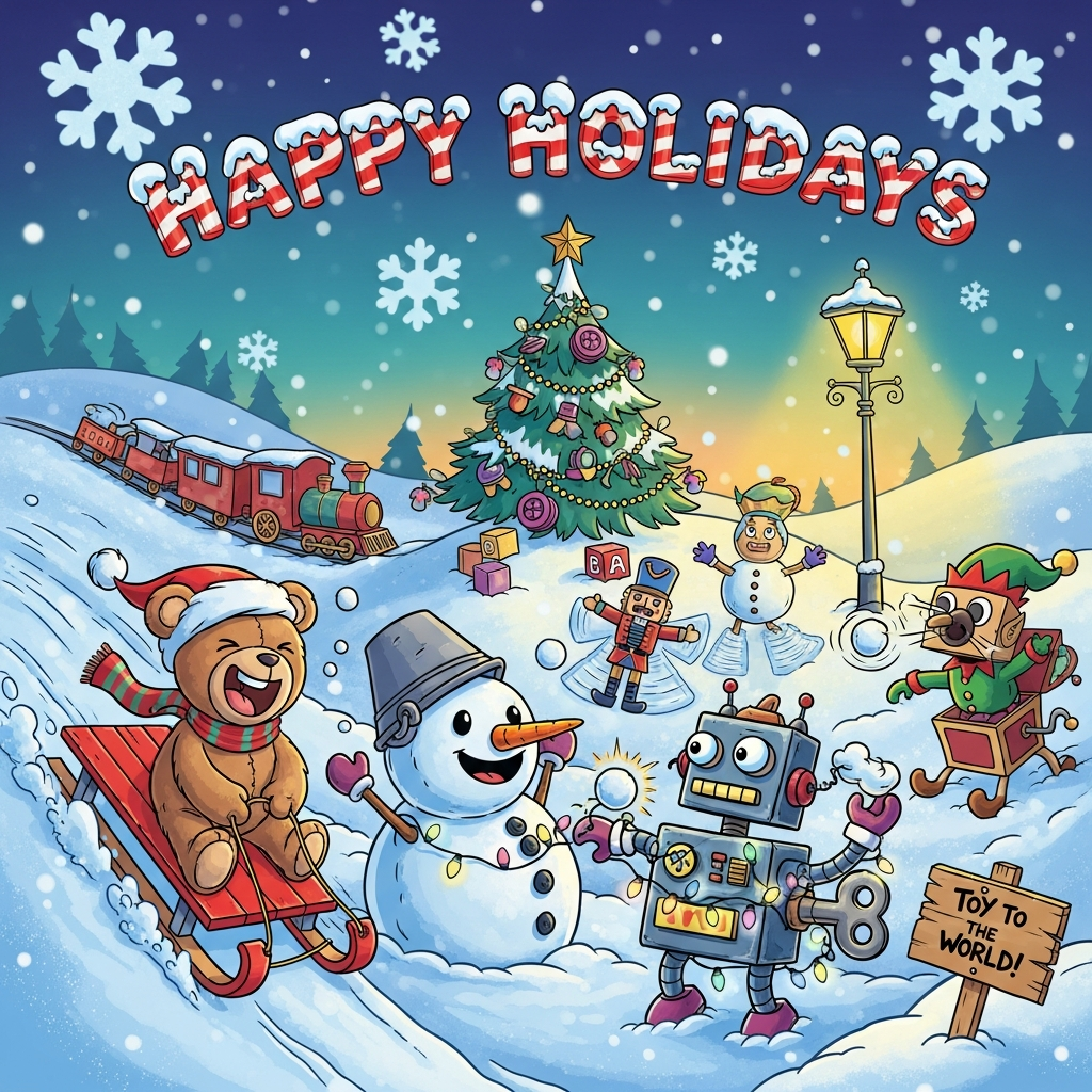 Playful cartoon scene in bright, saturated colors with thick outlines and exaggerated proportions. Full-bleed, portrait composition. A snowy toy-town wonderland at twilight: big fluffy snowflakes swirl under a teal-to-purple sky. Center stage, a jolly snowman built by toys—stick arms, carrot nose, a toy bucket helmet—while a wind-up robot (big eyes, tiny mittens, key in its back) tangled in blinking string lights tries to throw a snowball and accidentally bonks itself, sending sparks of cartoon mischief. To the left, a plush teddy bear in a Santa hat and scarf rockets downhill on a bright red sled, mouth wide with laughter, kicking up glittery snow spray. On the right, a jack-in-the-box pops out mid-boing wearing an elf hat, flinging snowballs like a tiny trebuchet. In the midground, a toy train chugs through the snow around a small fir tree decorated with ornaments shaped like tops, yo-yos, and building blocks, while a wooden nutcracker toy makes perfect snow angels nearby. Add lively motion lines, cheerful expressions, and dynamic, whimsical poses everywhere. Warm golden light from a lamppost glows against cool blue snow, with soft cel-shading and crisp shadows for depth. Render “Happy Holidays” at the top in candy-cane striped bubble letters with snowy frosting and a gentle glow. Place one extra cheeky caption on a little wooden sign staked in the bottom-right snowbank: “Toy to the world!” (no other text).