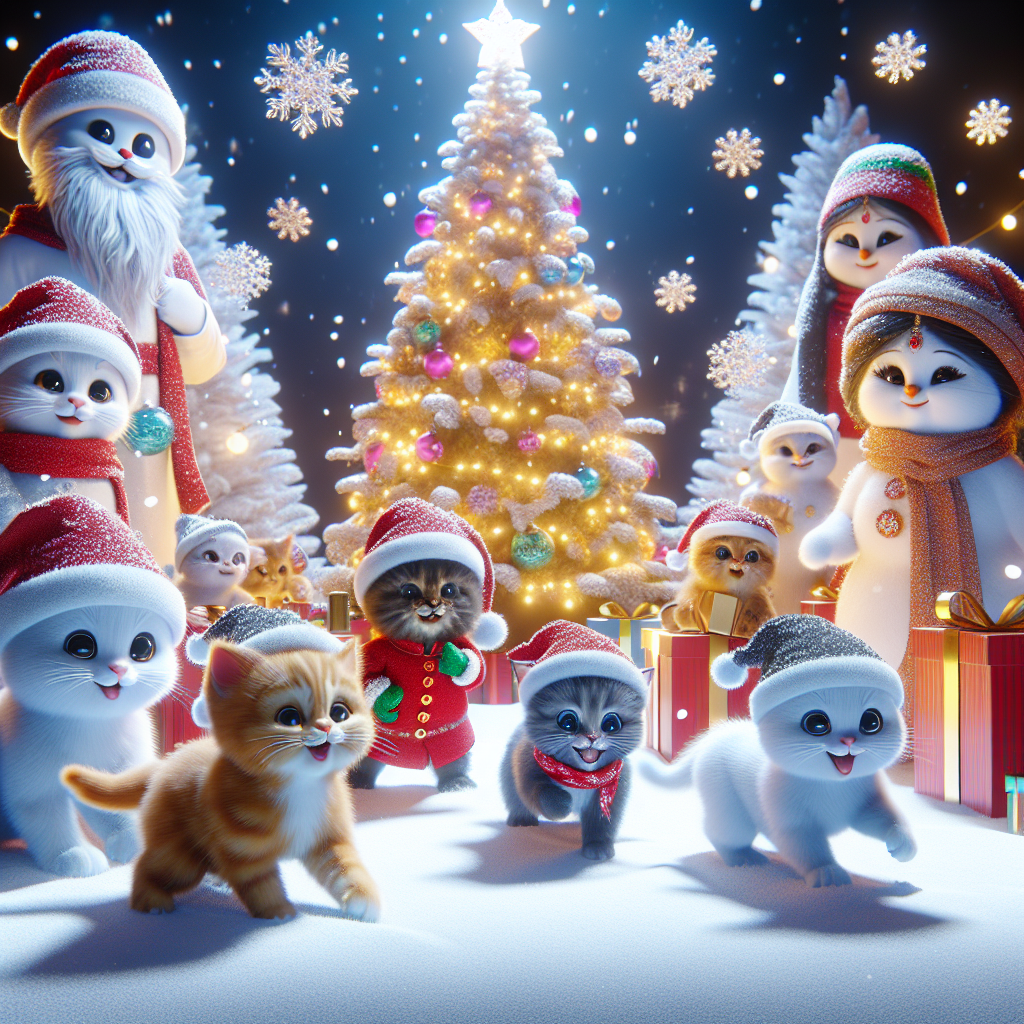 Visualize a cute cartoon Christmas setting where fluffy kittens in Santa hats frolic in the snow, chasing after gently falling snowflakes. A warmly lit Christmas tree stands tall, surrounded by wrapped gifts, and a family of snowmen watch the playful scene with button eyes and wide smiles.