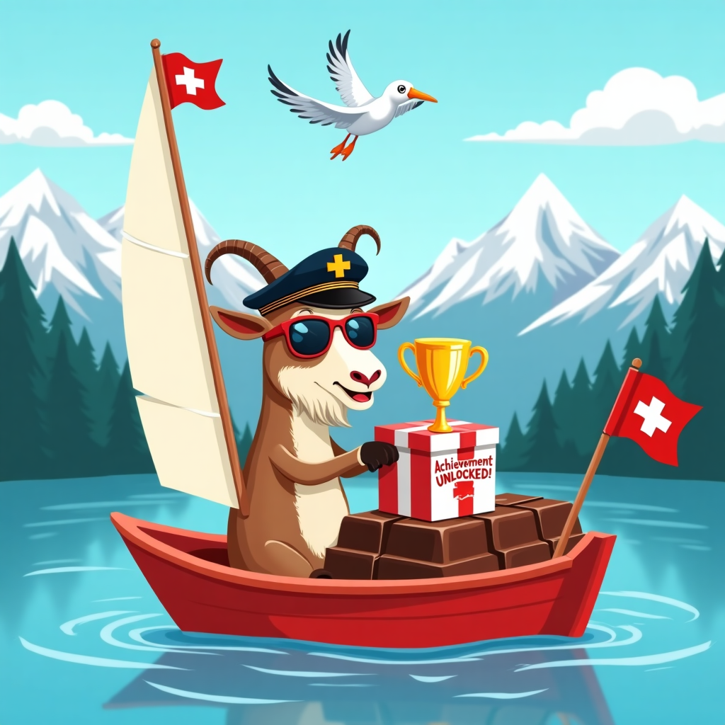 A cheerful Swiss goat wearing a captain's hat and aviator sunglasses sails a bright red toy sailboat across a giant bar of Swiss chocolate floating in a glistening mountain lake. In the background, the snowy Alps tower proudly under a sunny blue sky. On deck, the goat is unwrapping a present marked “Achievement Unlocked!”—inside is a golden fondue fork like a trophy. Seagulls overhead wave little Swiss flags and honk party horns. Everything is in clean, colorful vector style with bold, playful shapes and a humorous, lighthearted vibe.