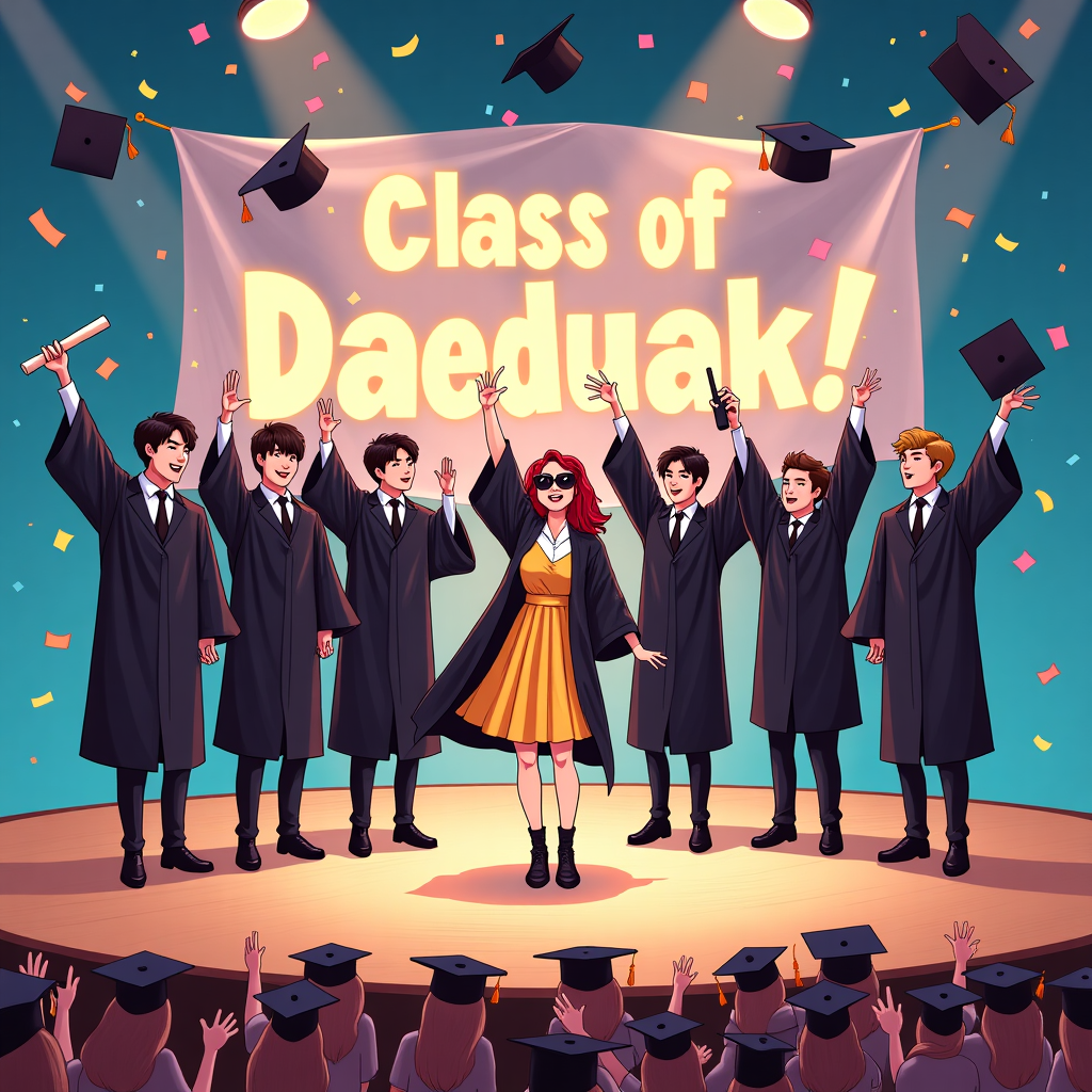 Create a vibrant and humorous illustrated scene where all seven BTS members are dressed in quirky graduation gowns and throwing their caps in the air—except one (Jin, maybe?) whose cap boomerangs back and hits him in the face. They're standing on a big, dramatic stage, confetti flying everywhere. In the middle, a super stylized version of Ashley (cartoonified, BTS fan-style, holding a diploma) is striking a triumphant pose with oversized sunglasses and holding a mic as if she just dropped a hit single called “Grad-uation.” Behind them, a sparkling banner reads "Class of Daebak!" and one of the BTS members (perhaps J-Hope) is doing finger hearts toward Ashley, with “Army Approved!” stamped in bright letters in the background. Add random dancing mini-armies of graduation-cap-wearing BT21 characters cheering wildly in the foreground for an extra hilarious touch.