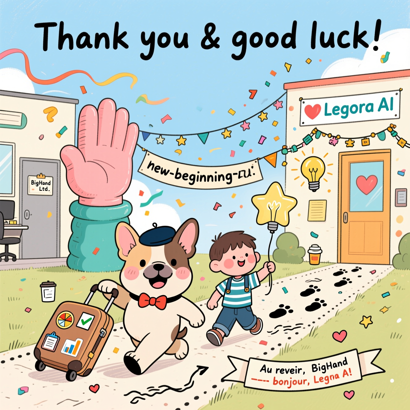 - Left background: a friendly office with a whimsical giant foam hand sculpture waving, subtly labeled on a small door plaque: BigHand Ltd. Streamers drift away to suggest goodbye and gratitude.