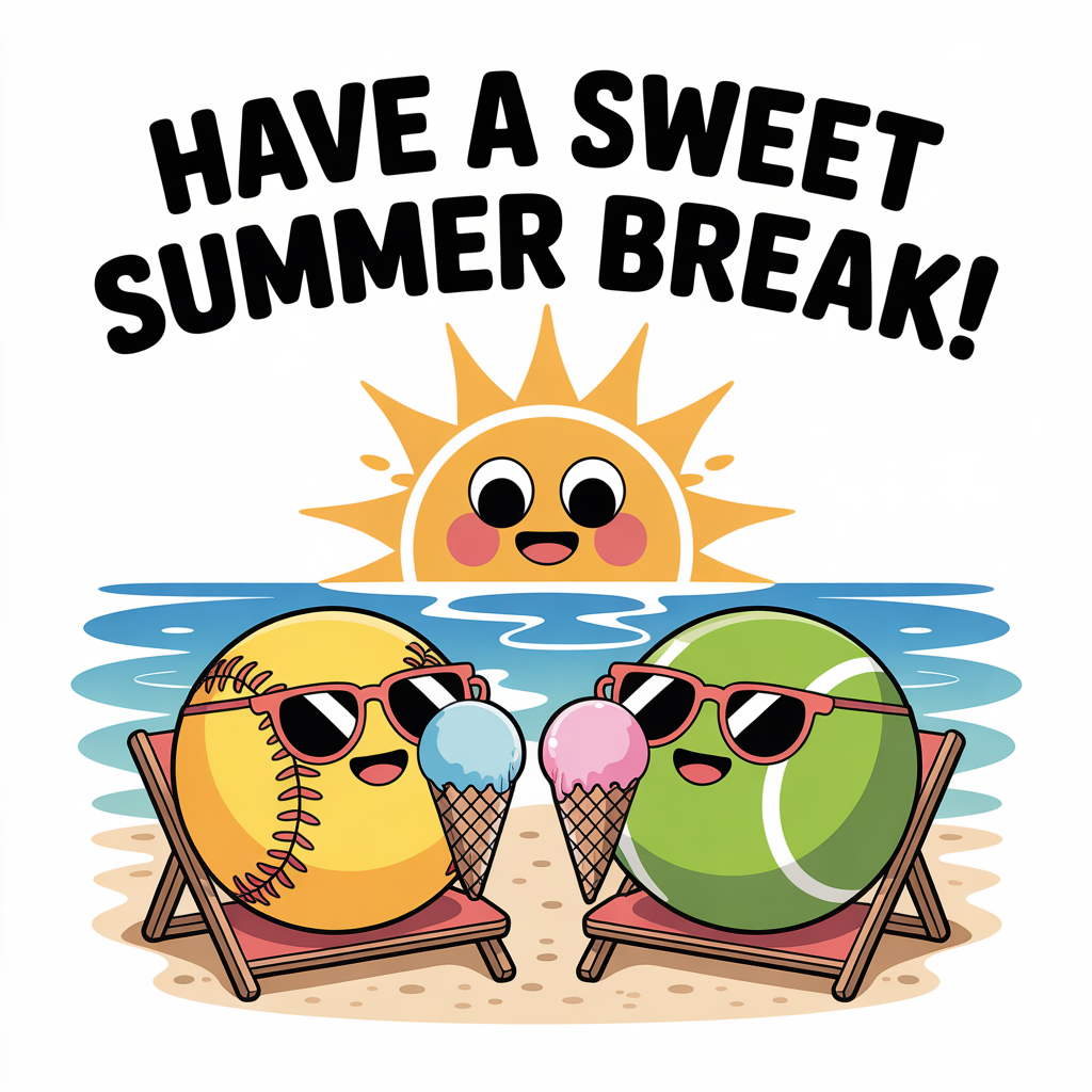 - Below, illustrate an adorable anime-style scene where a softball and a tennis ball, both with cute smiling faces, are lounging on a beach, wearing tiny sunglasses and enjoying ice cream cones. The sun in the background is drawn with a cheerful, blushing face, casting playful rays over the scene.