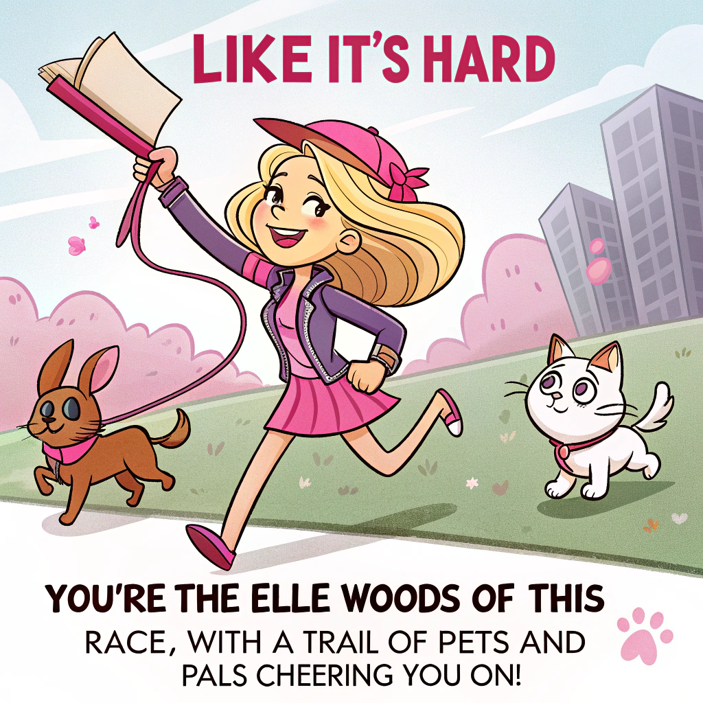 At the bottom of the image, "You're the Elle Woods of this race, with a trail of pets and pals cheering you on!"