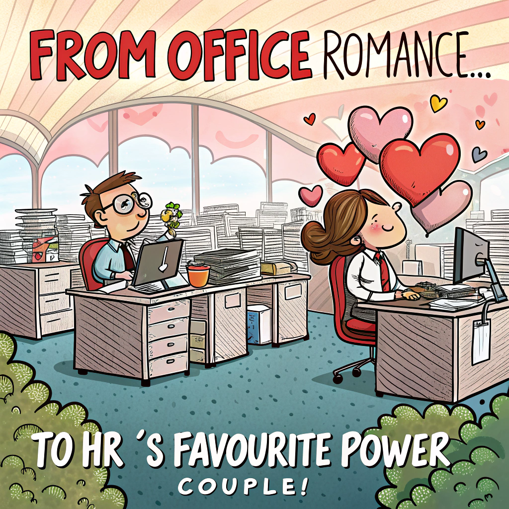 In the center, illustrate a playful cartoon scene: a bright, exaggeratedly colorful open-plan office with two characters (you and your boyfriend) sitting at desks facing each other, each grinning widely. Both desks are piled with silly over-the-top "couple" items — matching coffee mugs with hearts, identical desk plants, and one ridiculously long phone cord that’s tangled between them like spaghetti. In the background, amused co-workers peek over cubicle walls with raised eyebrows, and a cartoon HR character in the corner is giving a dramatic thumbs-up.