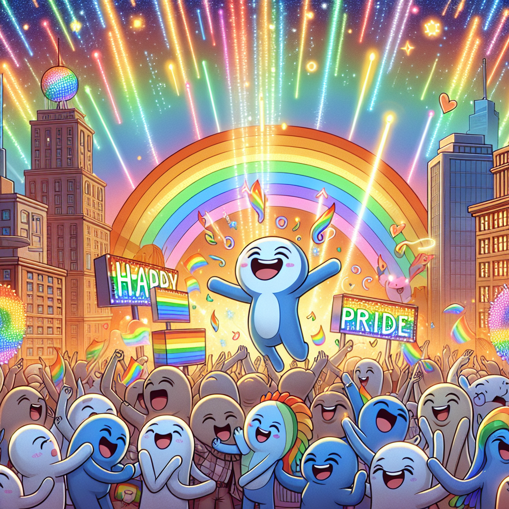 In a whimsical cartoon cityscape, the sky is filled with the vibrant colors of pride, radiating a welcoming warmth over the urbane skyline. Adorable, non-human cartoon characters express joy, each engaging in a lively dance that symbolizes the rhythm of triumph. Bursts of rainbow-colored light rain down from the sky, while an illuminated sign that says 'Happy Pride' glows in radiant colors above the rejoicing crowd. They revel together, unified under a collage of achievements and the communal liberty of expressing their authentic selves.