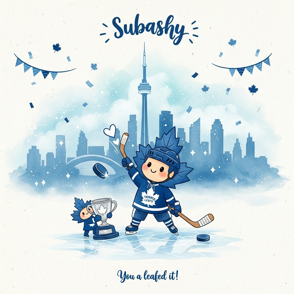 A cute watercolor celebration inspired by the Toronto Maple Leafs: a cheerful chibi maple-leaf character skating on a glistening ice rink, wearing a deep blue-and-white hockey jersey and tiny helmet (no official logos or wordmarks), raising a stick as a puck with a little white heart sparkles mid-air. A mini maple-leaf buddy hugs a silver trophy with a simple white leaf motif. Behind them, a dreamy Toronto skyline with the CN Tower in misty blue washes, delicate gradients, subtle pigment blooms, and natural cold-press paper texture. Confetti of tiny blue and white maple leaves drifts down; blue-and-white bunting flutters; soft star-dust speckles add a celebratory glow. Color palette: Leafs-blue, crisp white, icy teal, and soft silver. Wet-on-wet softness, feathery edges, airy, adorable mood.