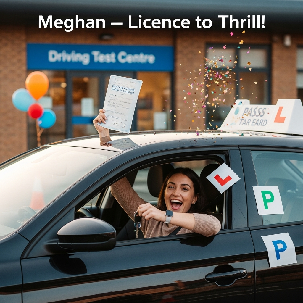 Ultra-high-definition 4K UHD, true-to-life photo, rich depth of field. Vertical, full-bleed portrait. A jubilant brunette woman sits in the driver’s seat of a shiny black car parked outside a generic “Driving Test Centre” (simple, non-branded sign). She’s leaning out of the open window with a huge grin, one hand triumphantly holding up a pass certificate and car keys, the other mid-peel yanking off a red “L” plate magnet from the door. A green “P” plate is already stuck on the rear window, visible in the shot. Friends just out of frame have tossed a burst of biodegradable confetti that catches the sunlight, creating colorful bokeh. One orange traffic cone in the background has a single balloon tied to it for a cheeky celebratory touch. The car’s glossy black paint shows crisp reflections of sky and building; lifelike textures on the woman’s hair, skin, and fabric; seatbelt visible for a responsible-yet-excited vibe.